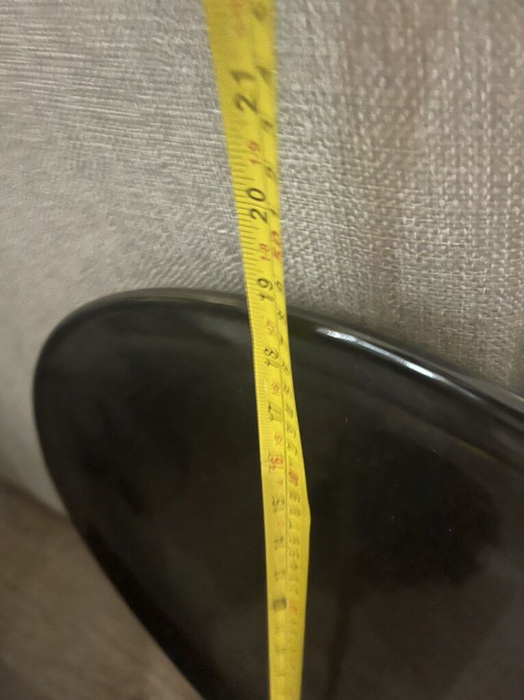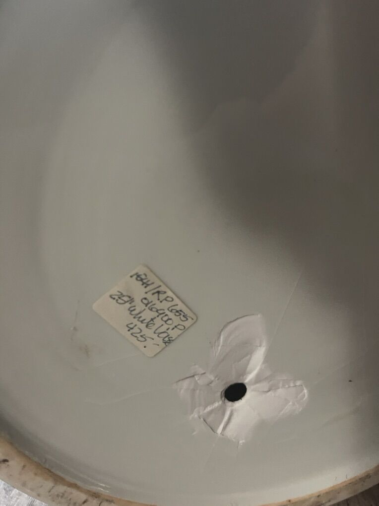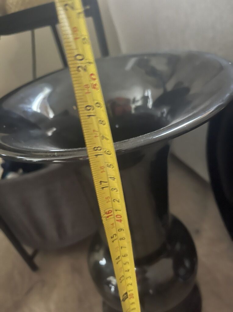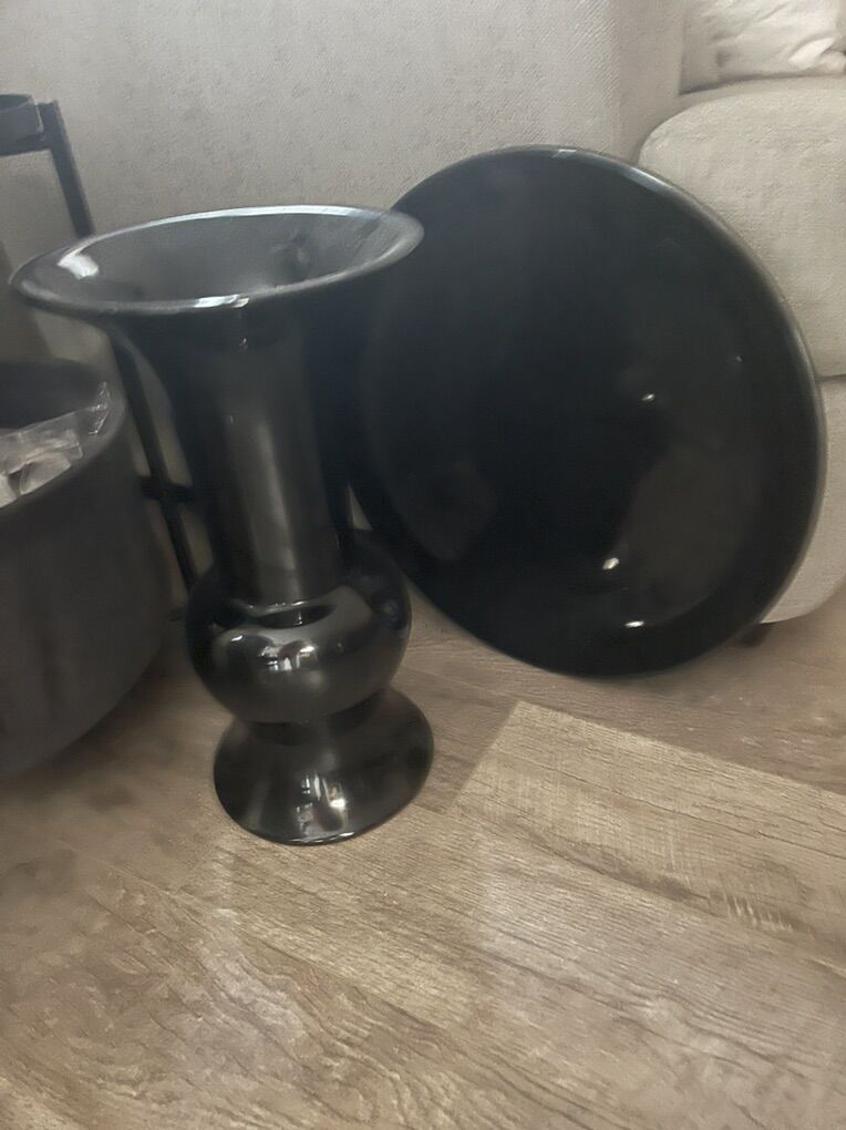 White and black vases the tall one is 42 inches the two white ones are 2 feet the black one is 18 inches and the black plate is 18 inches across they are ceramic. No cracks or chips perfect condition the original price are from the plate and the small white vases. They are over twenty years old
