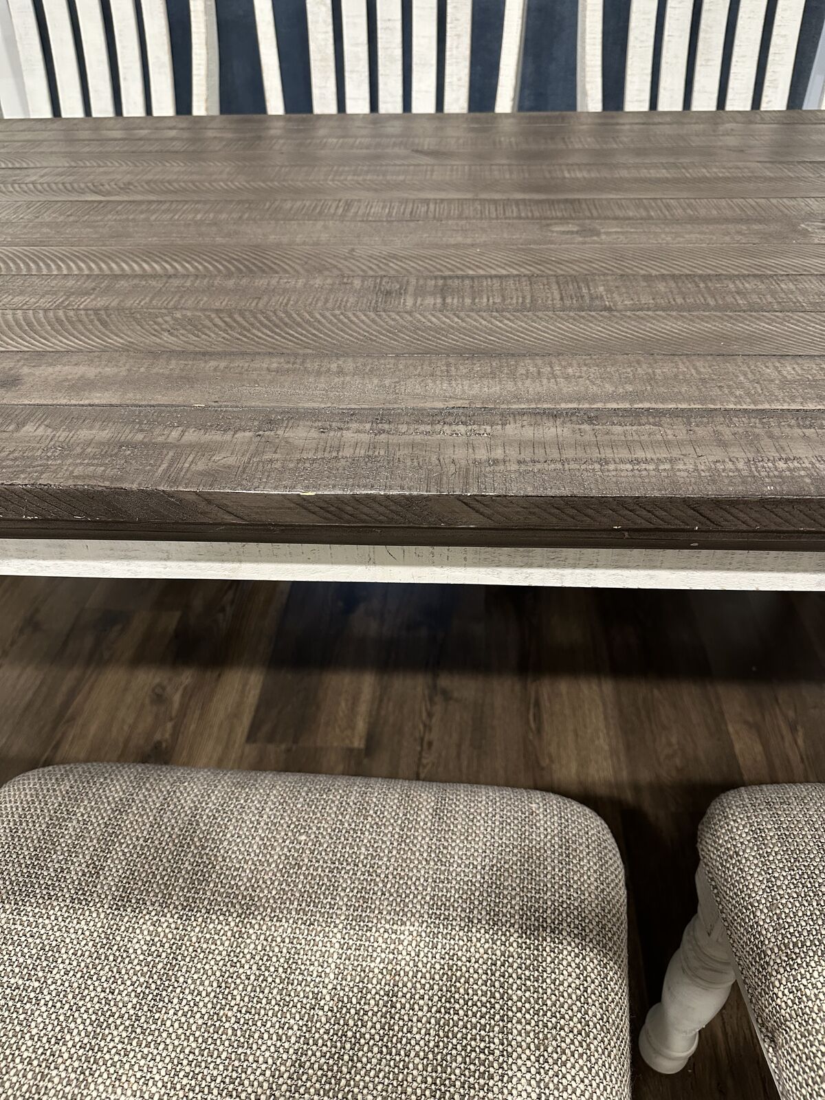 Previously protected with plastic on table + chair cushions Clean, sturdy, and well cared for Minor cosmetic nicks on table side from chairs