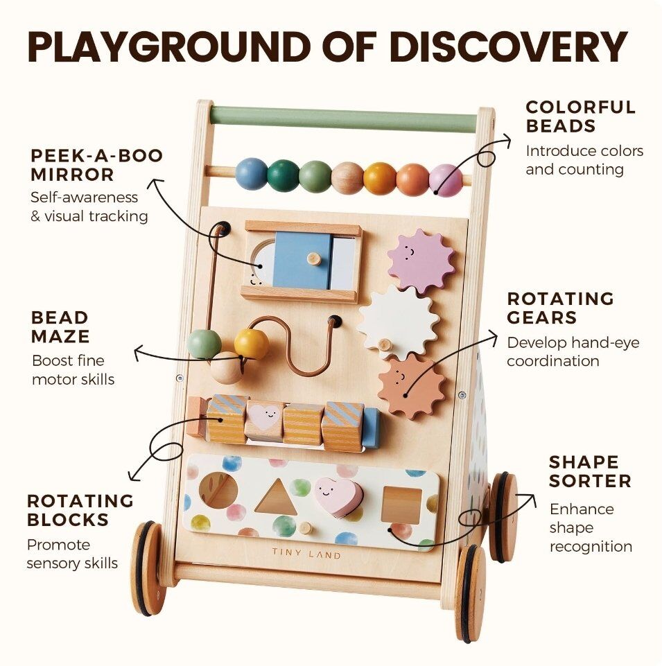 Tiny Land Wooden Baby Walker, Adjustable Speed Baby Push Walker for Boys and Girls, Montessori Activity Center Push Toy for Kids' Development, Ideal Christmas Gift for Toddlers (Morandi)