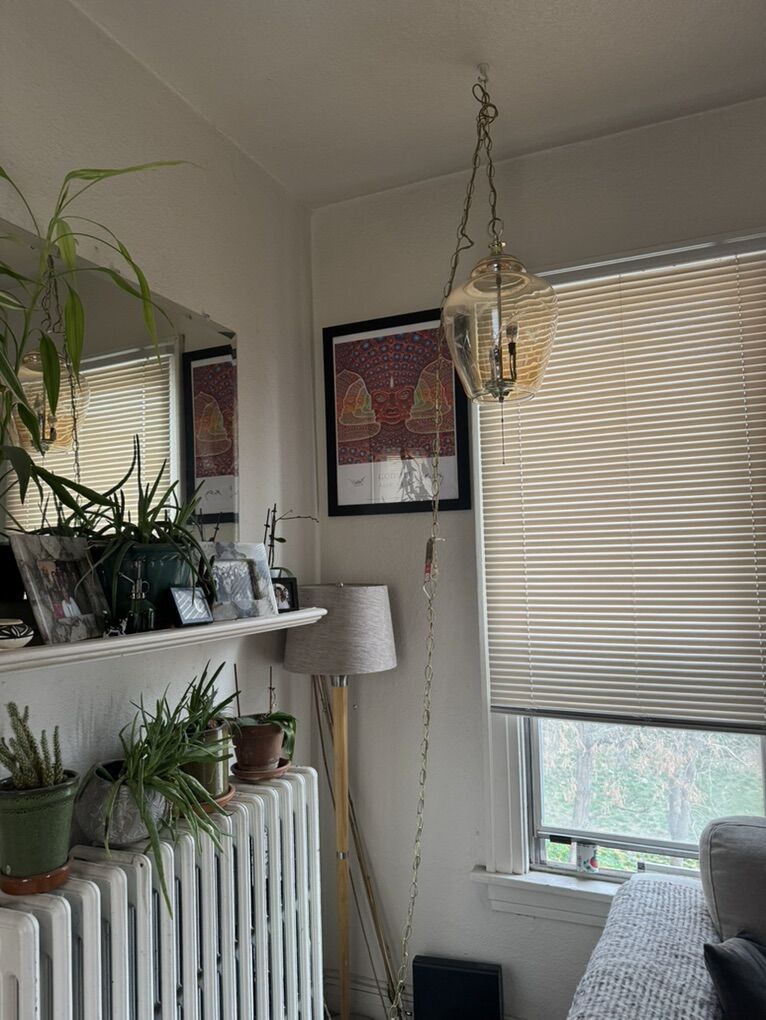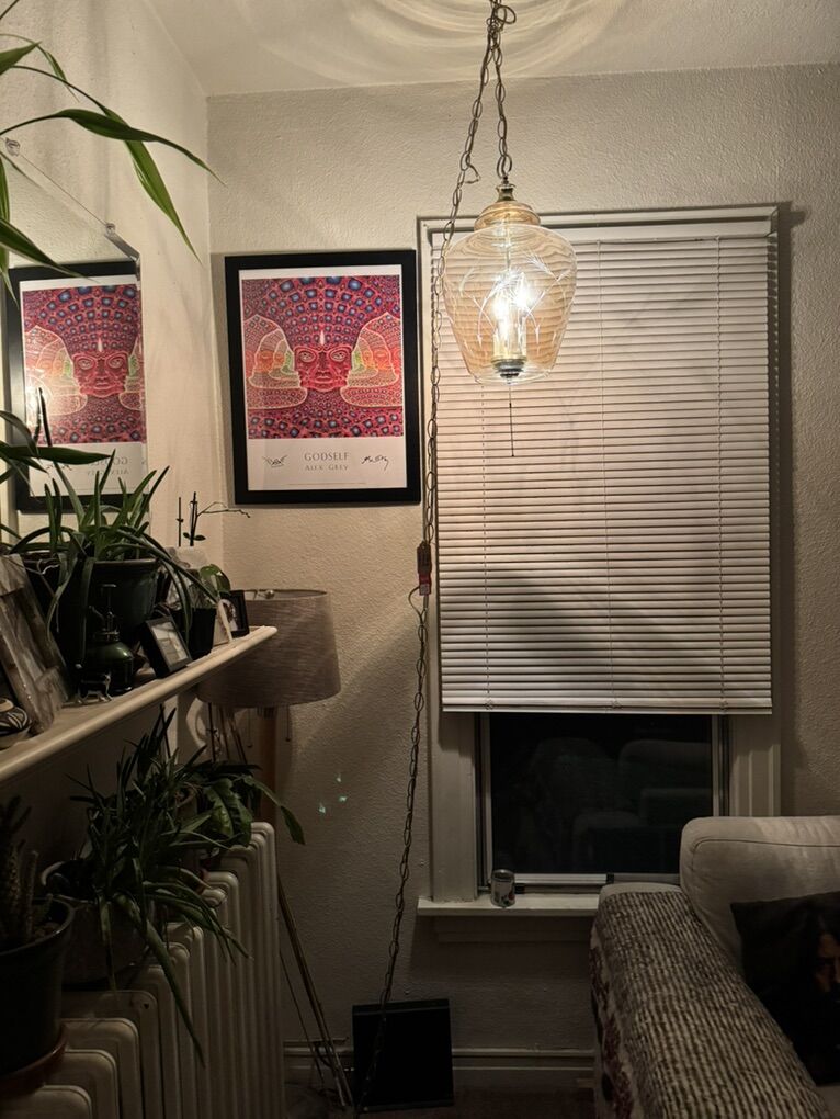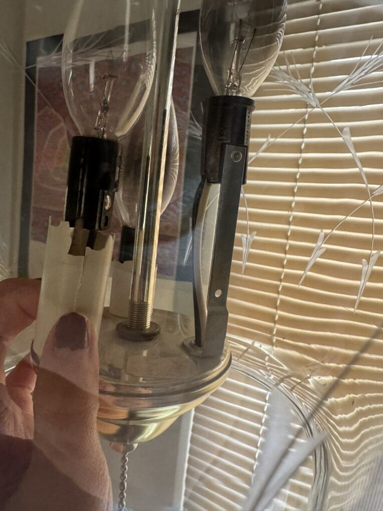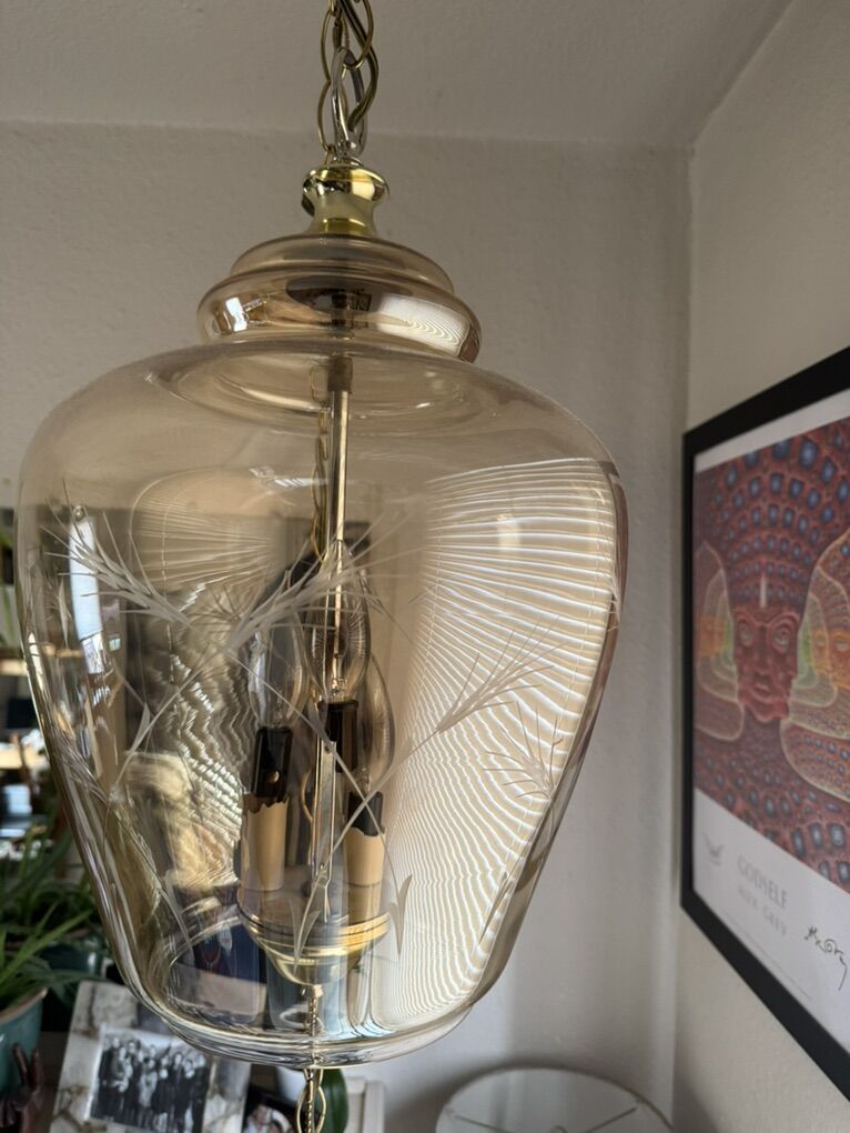 VenmoBeautiful tinted glass with wheat-looking etchings. Works well, currently has 3 lights in it.