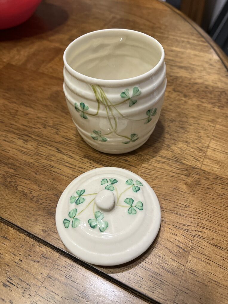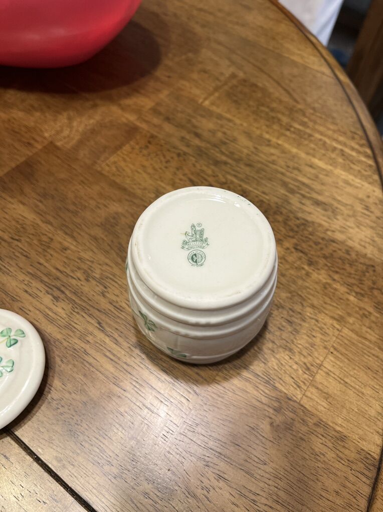 VenmoBelleek Irish Shamrock Barrel Marmalade or Honey Jar with a lid, featuring a textured basketweave pattern. It is crafted from porcelain and hand-painted with green shamrocks