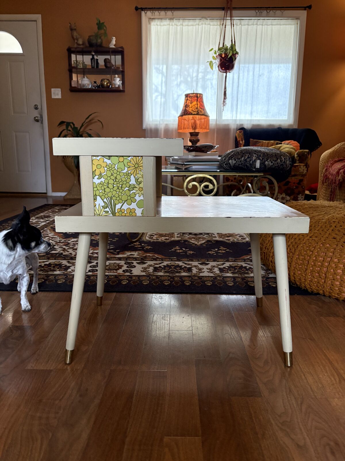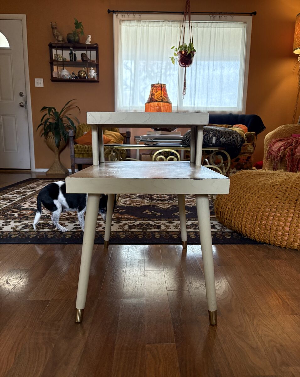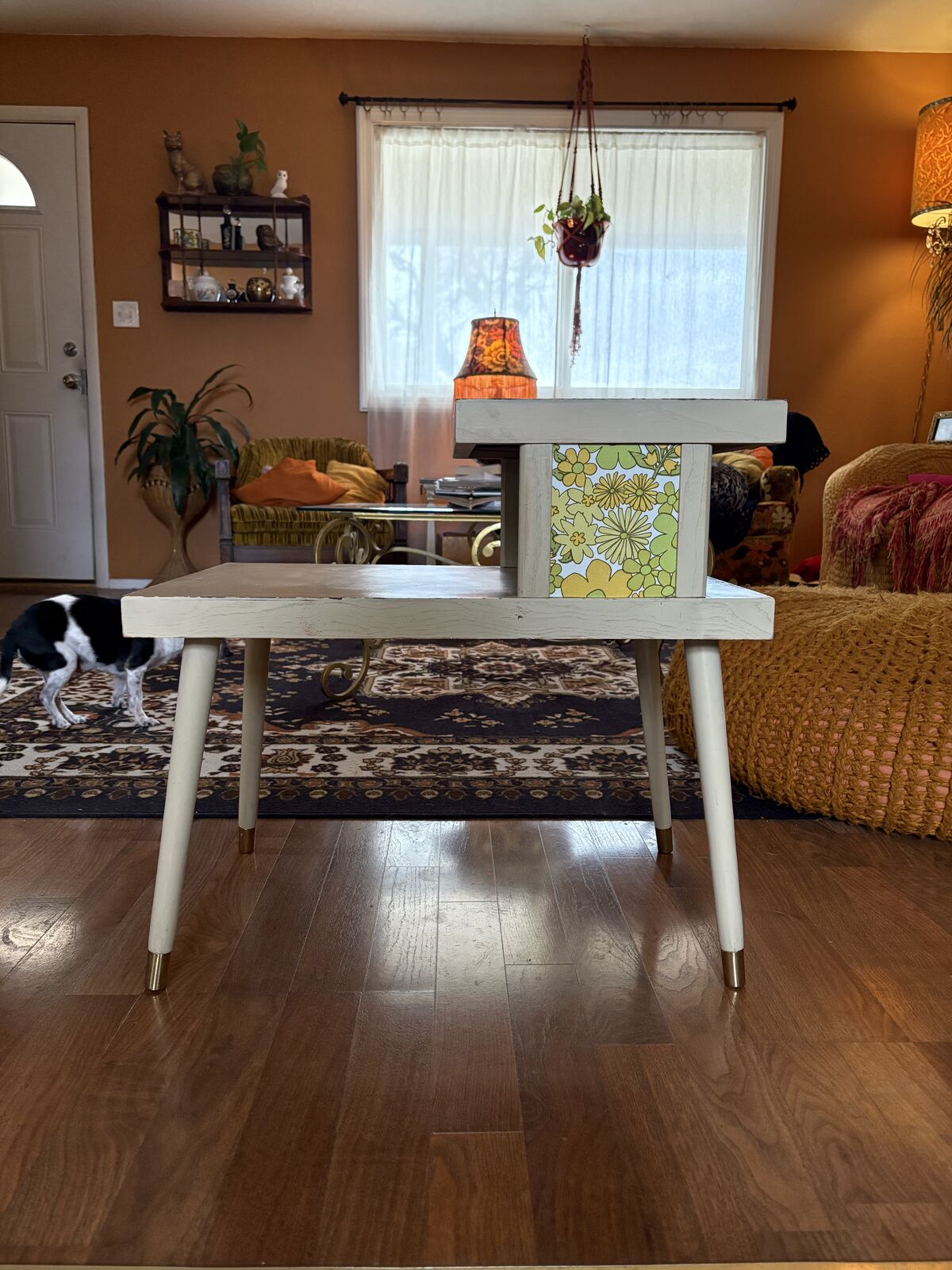 VenmoCute 2 tier side table in ok condition… it’s very cute, sturdy and functional but it’s got plenty of dings and scratches. It’s a wood look laminate with gold tone on the legs. I added the vintage wallpaper to the sides. Pick up in Taylorsville just off the freeway. Venmo or cash only, Venmo to hold, FCFS.
