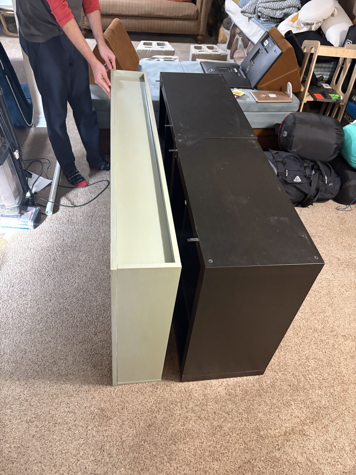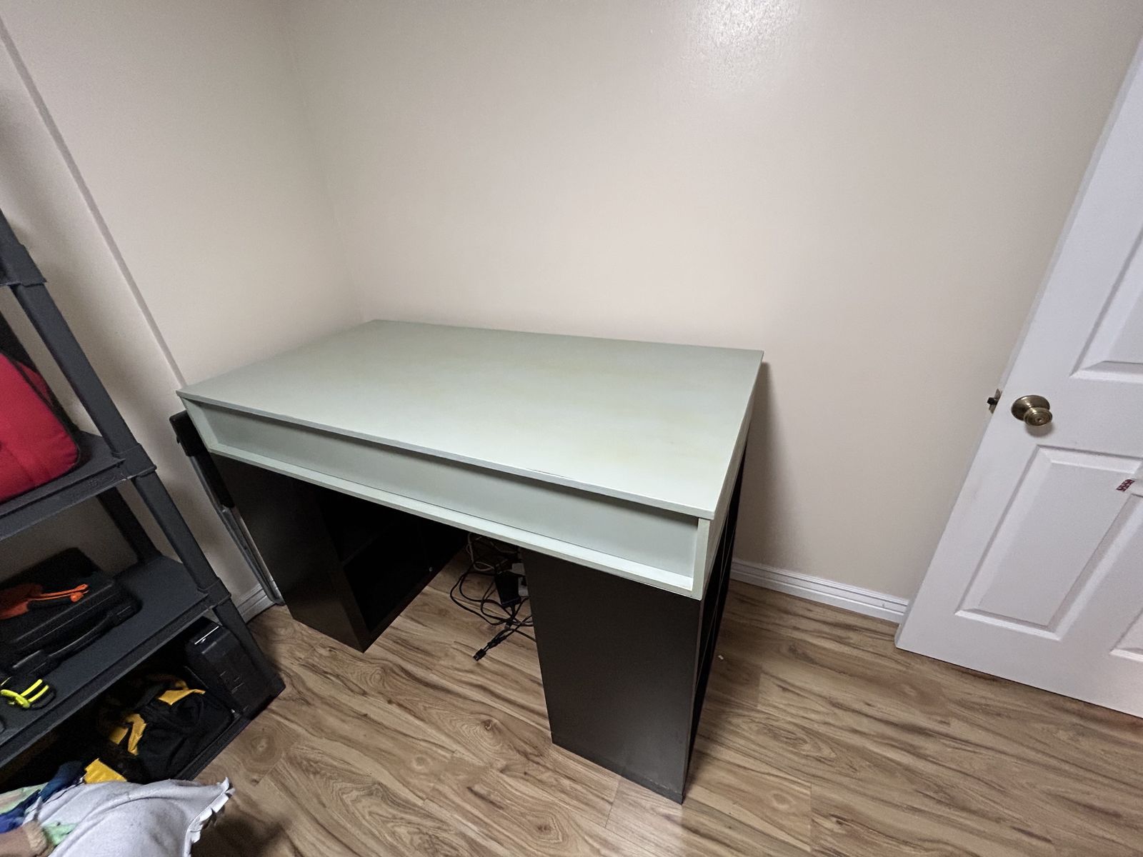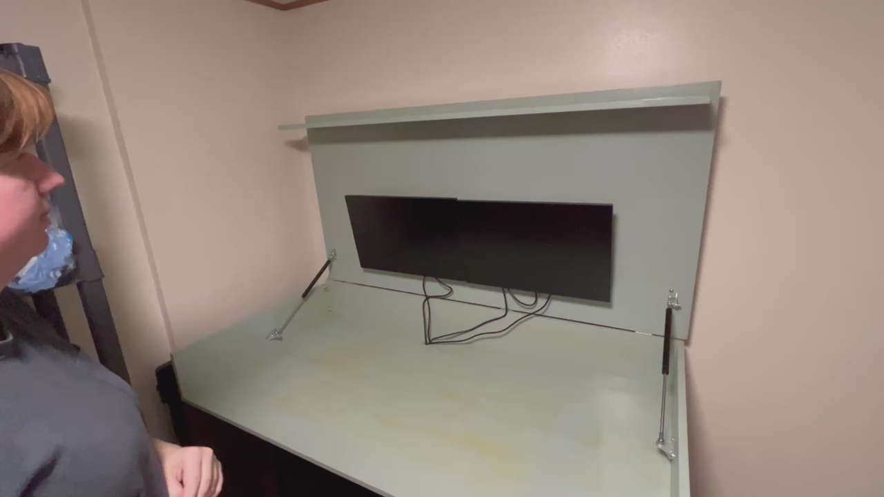 VenmoWhile living in a tiny space my husband and I designed and built this desk to serve as a home office when we didn't have a spare room to do the job. Monitors can be easily mounted inside for a variety of monitor sizes and we are happy to leave the two in there currently for you. The open/close function relies on gas struts rated to support up to 250lbs. The support legs are 4 Cube Shelves that work great for holding a printer, books, or any other storage needs. We have LOVED this home office solution but due to an upcoming cross country move we have decided not to take it with us. Hopefully it can serve another family now :)