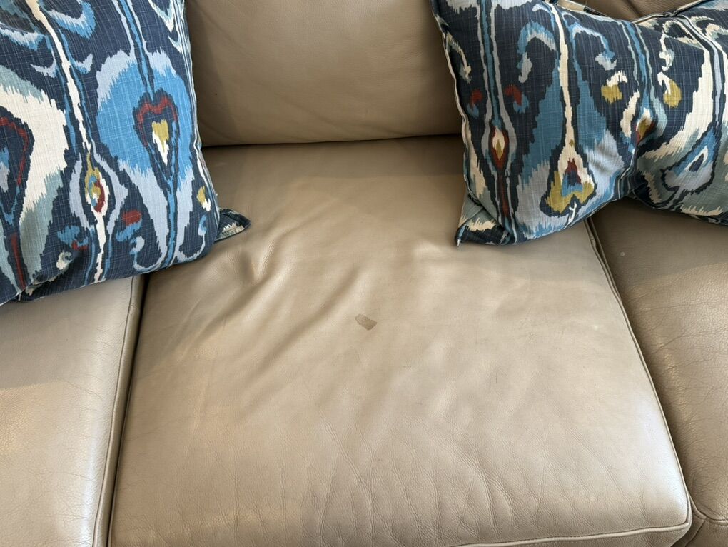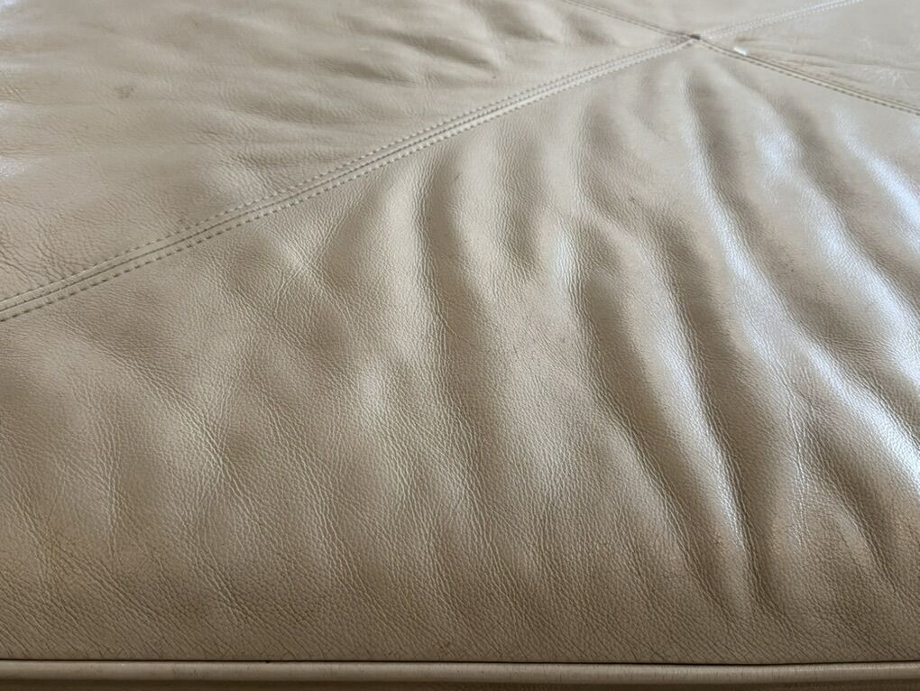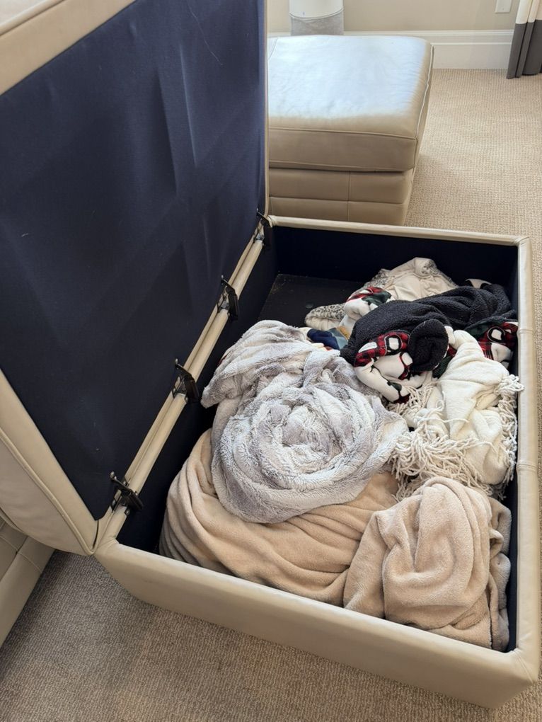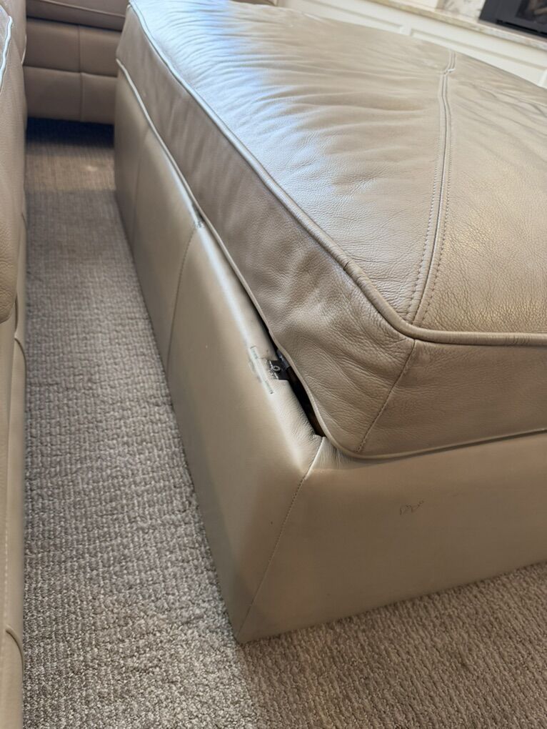VenmoBasset leather sectional and ottoman. Comfortable. Normal wear and tear shown in pictures. Ottoman is on casters, opens for storage. One of the hinges on lid is bent, but still functions fine. Sectional is 3 pieces: 3 seat R arm- 78 in, single armless seat- 24 in, and Left arm chaise 30 in W x 62 Deep. Height: 34.5, total length 132 in. Ottoman: 48 x 32 in. Text is best way to reach me.