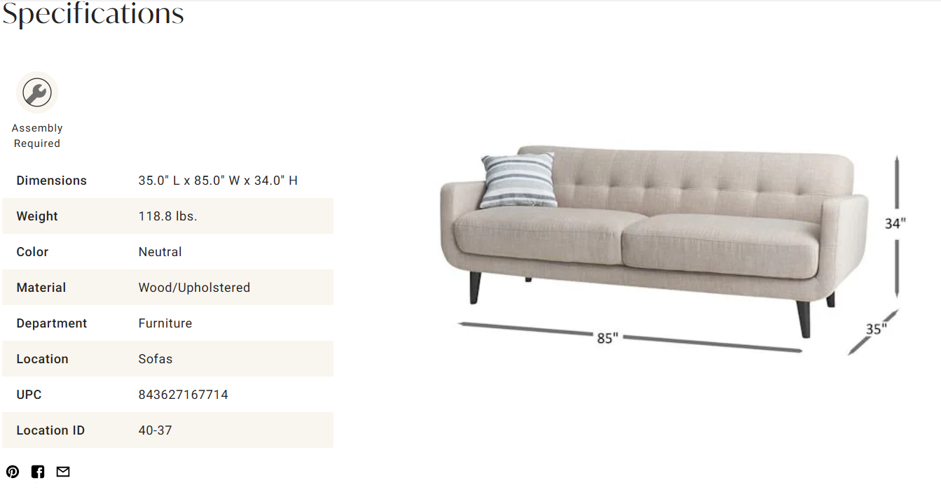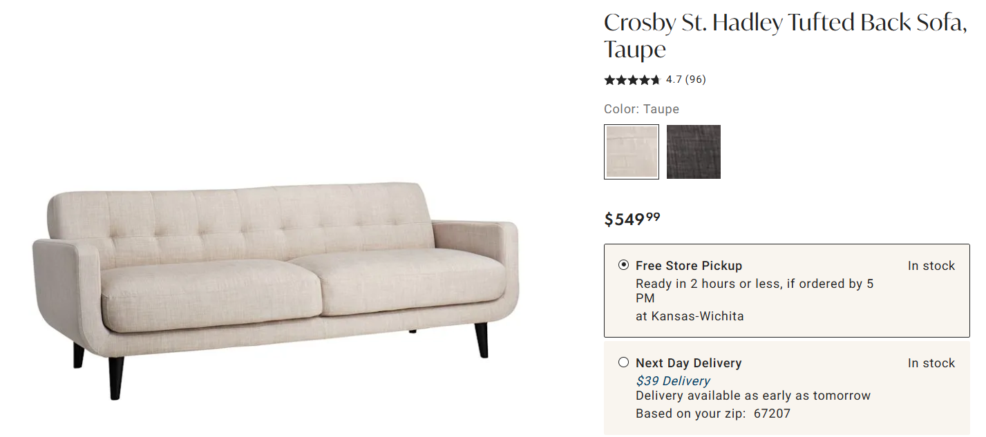 BRAND NEW, already assembled for you. Crosby St. Hadley Tufted Back Sofa in Taupe, sells from At Home for $550. Priced for immediate sale. Dimensions are 85"Lx35"Dx34"H. Never been used, smoke-free and pet-free home.