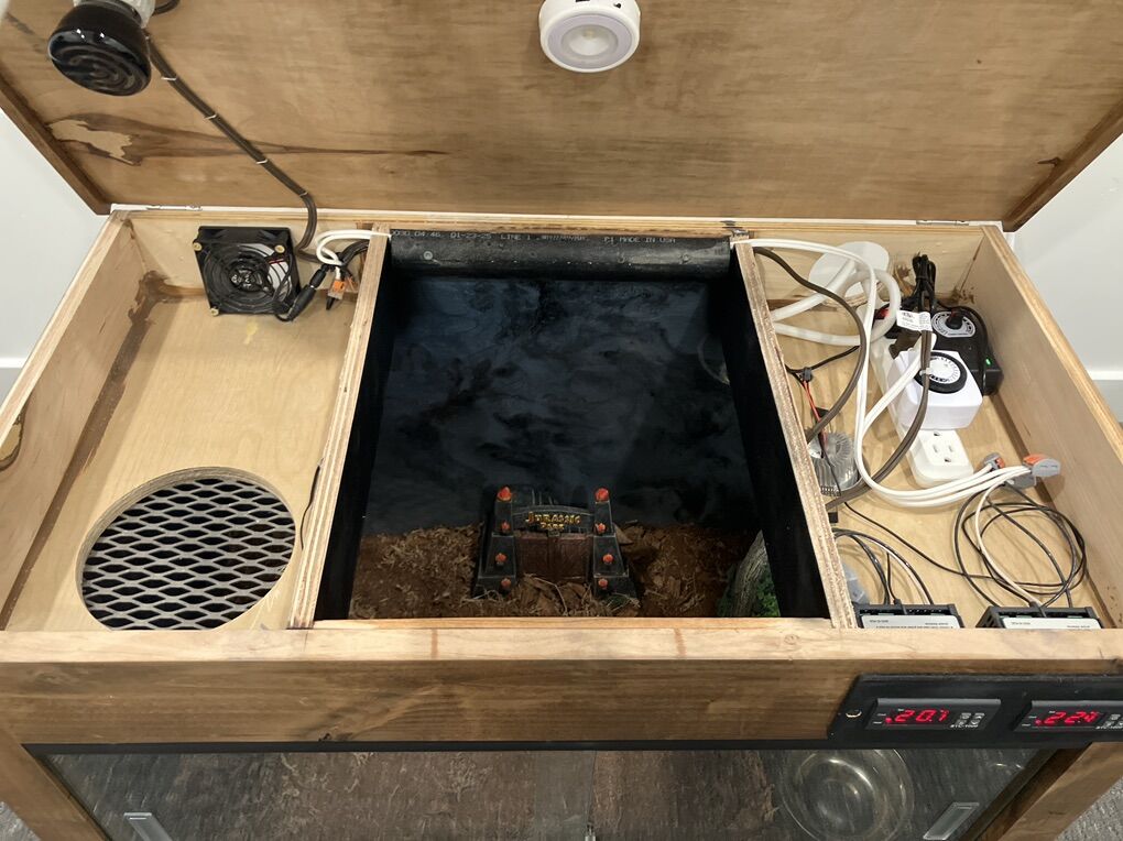 VenmoHandcrafted 30 gallon reptile enclosure. Enclosure has already in place heating pad & heat lamp to regulate temperature on both hot and cold side. Water bowl and decor included (see pictures) but substrate is not included. We loved this enclosure for our ball python before deciding to upgrade to a larger size.