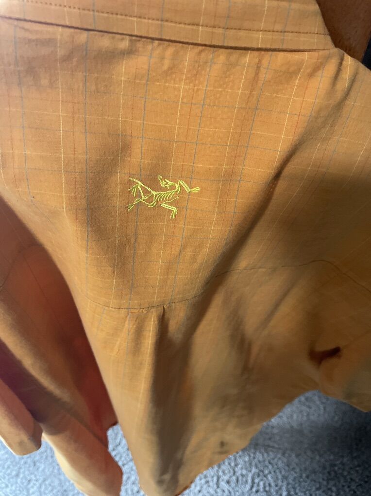 Used like new men’s size L ARCTERYX shirt orange color Button up Hike Fishing Camping gorpore asking $45.00 cash and pickup at West Jordan thanks