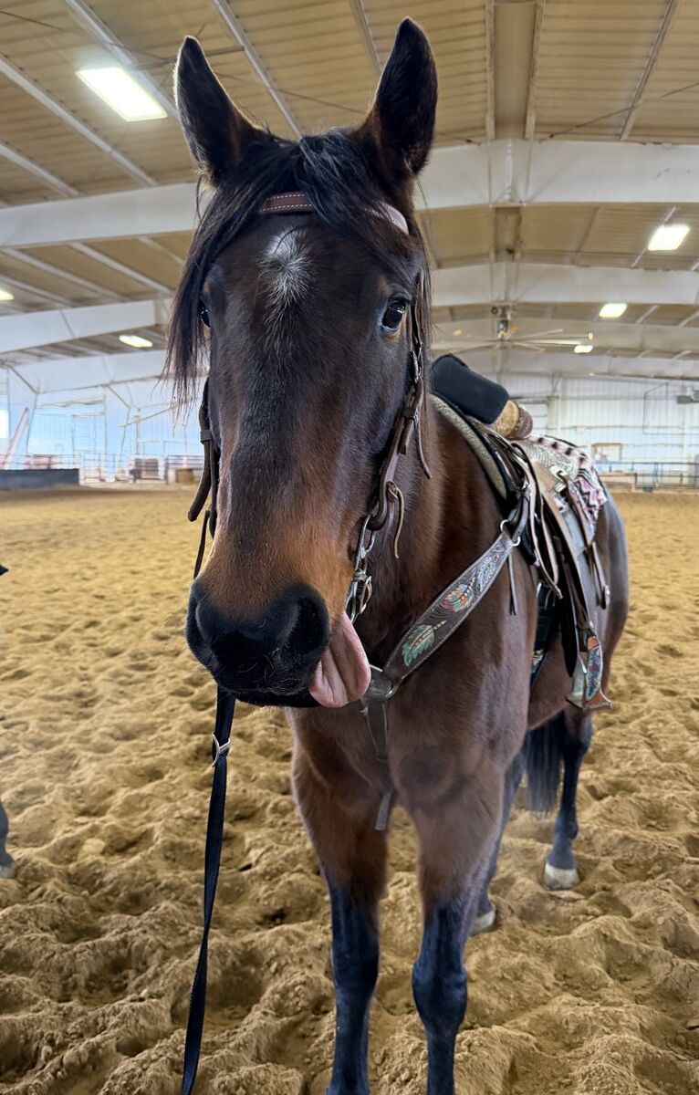 Kates Little Red is not Little or red. Kate is a big bay 9 year old mare and is 16.3 hands. She is as kind as she is big. She is a complete sweetheart She has been to a few gymkanas. She runs barrels and poles. She is currently being worked on the barrels. She would also make a nice hunter jumper or even a dressage prospect. She loves jumping. Kate is a beautiful mover. She trail rides, she is not buddy sour, no buck, bolt or rear. She is super solid. Her only vice is she sticks her toung out to the side not while being ridden. I had her teeth floated 11/2/25 my vet gave her a thorough check and said it's part her personality since she has always done this. He said it's a baby thing that she never grew out of. She is super gentle and well behaved. She does require a advanced rider because she is has more go than whoa.