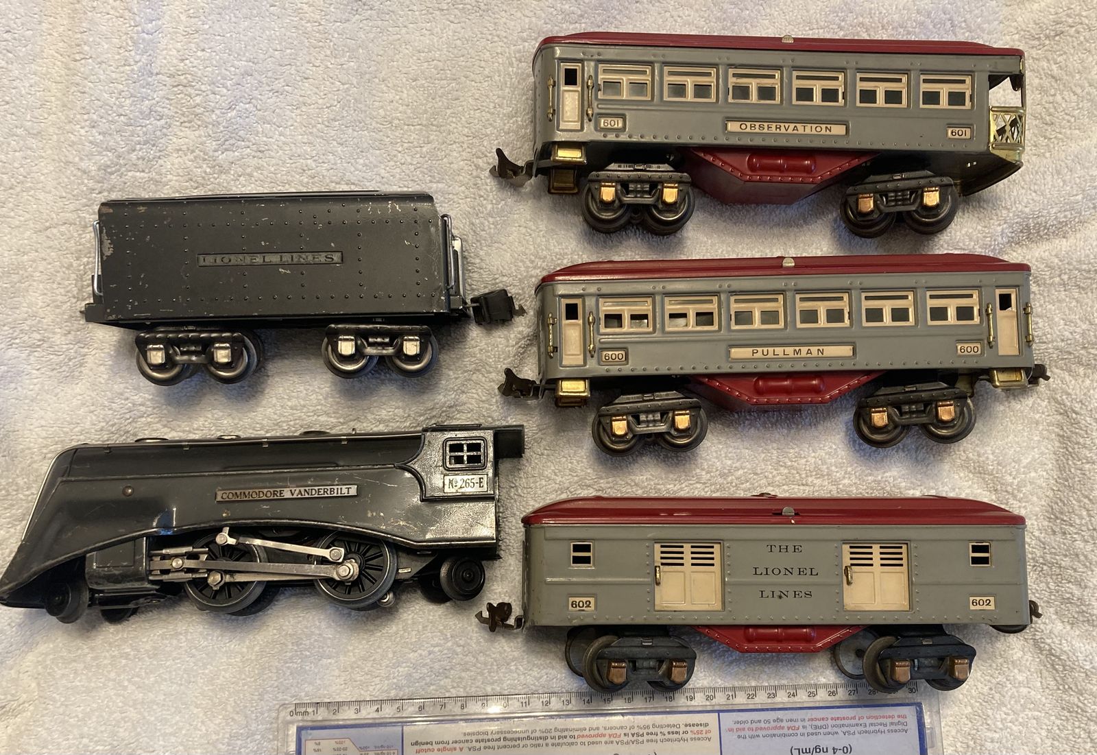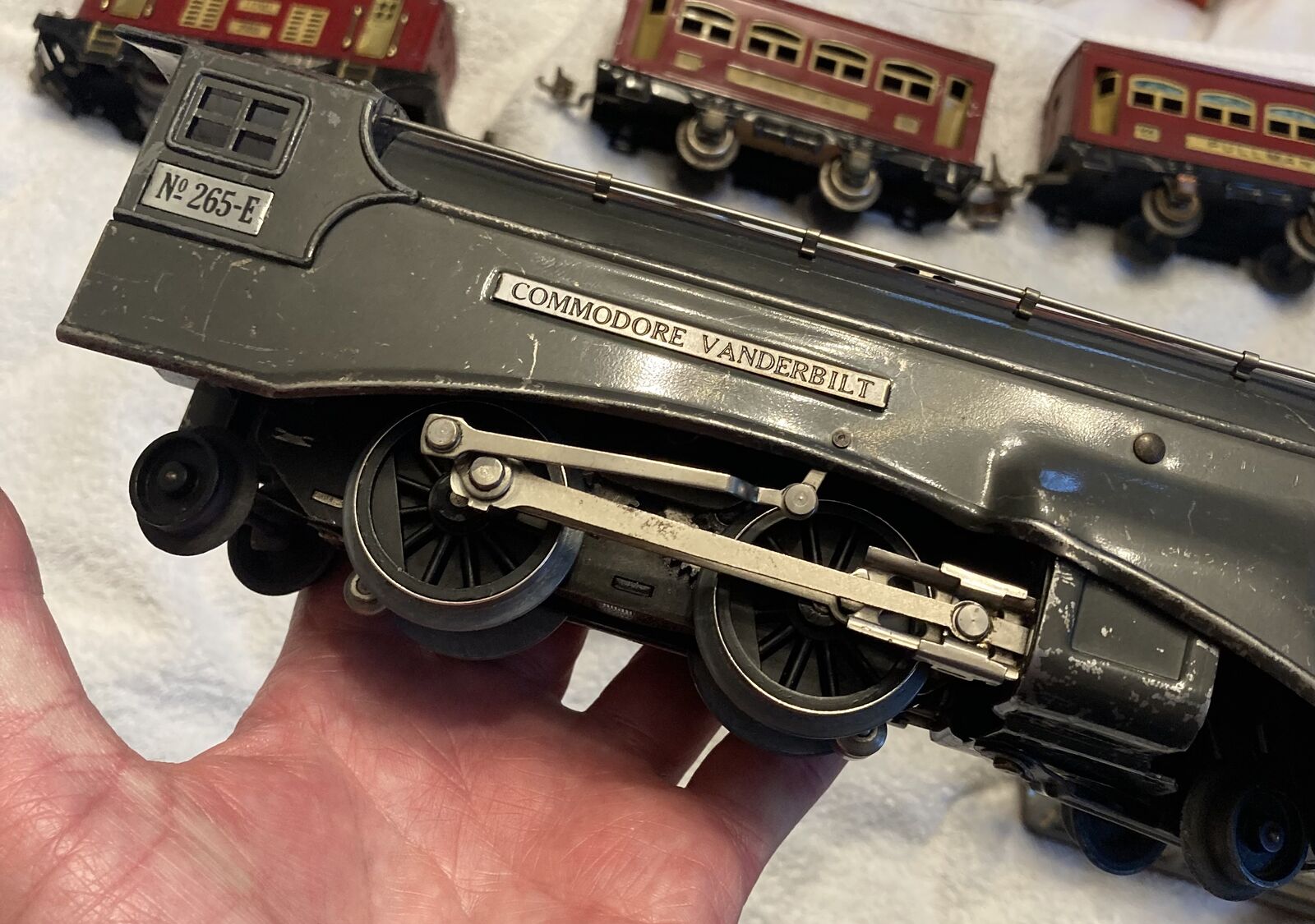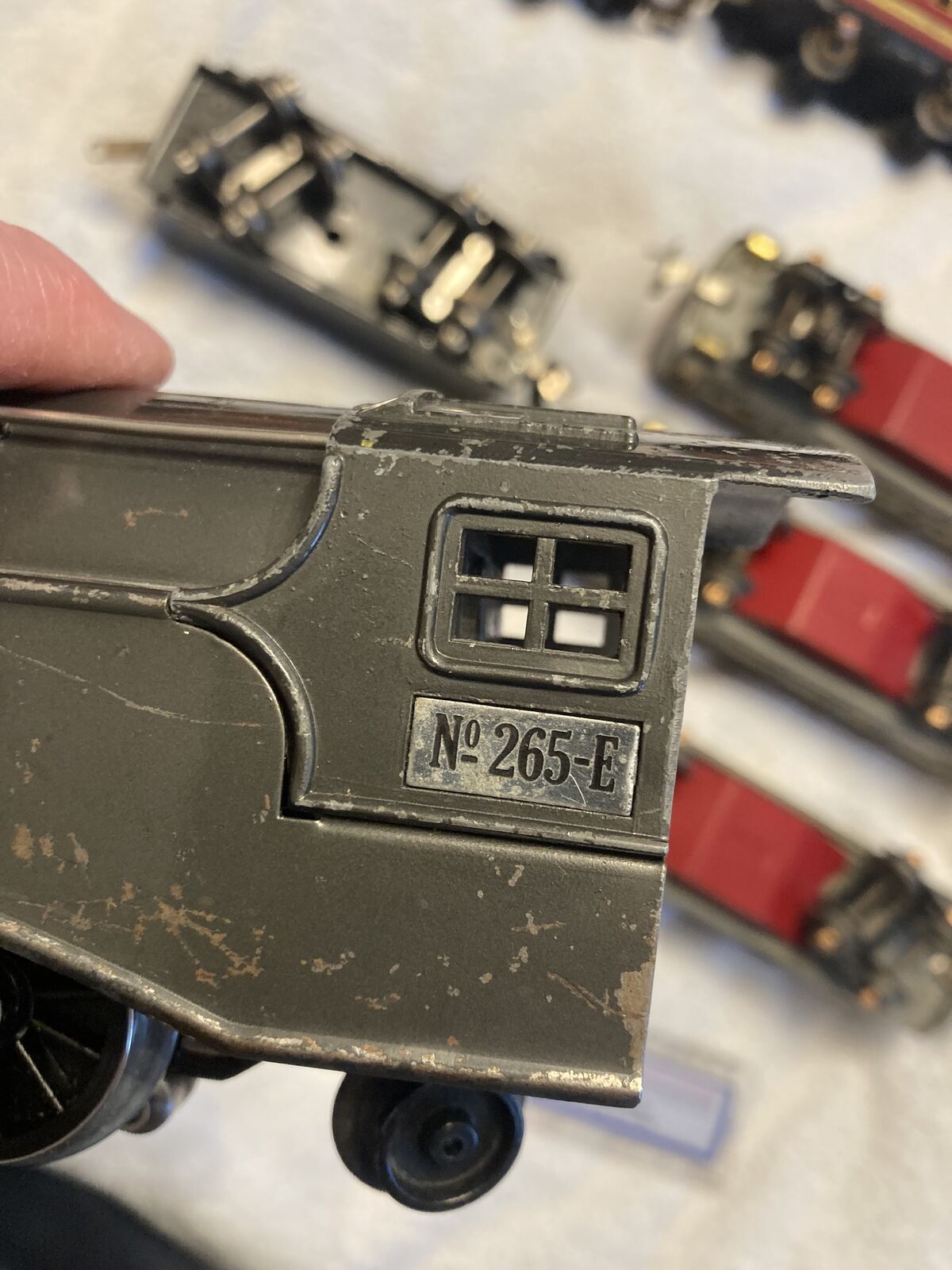 Up for sale is a Lionel prewar 265E Commodore Vanderbilt Locomotive circa 1935-1940, a 265T Tender and a passenger outfit with 600, 601, and a 602 passenger cars. Bench tested the loco ran fine forward and reverse. Set seems in fine condition everything seems all original, with the exception of the drive wheels on the locomotive that have been replaced at one time. The cab on the locomotive appears original very unusual as these often crumb with zinc rot and are replacements. The cars are complete the paint seems very nice but very dull could use a good waxing. Also the wiring on the passenger cars is very brittle and the insulation is missing in spots, it will have to be replaced, the pickup rollers have set screw holders for the wire so no soldering needed there. Bulbs are missing for the cars but are readily available. This is a very eye catching set for display or for flying around your layout.
