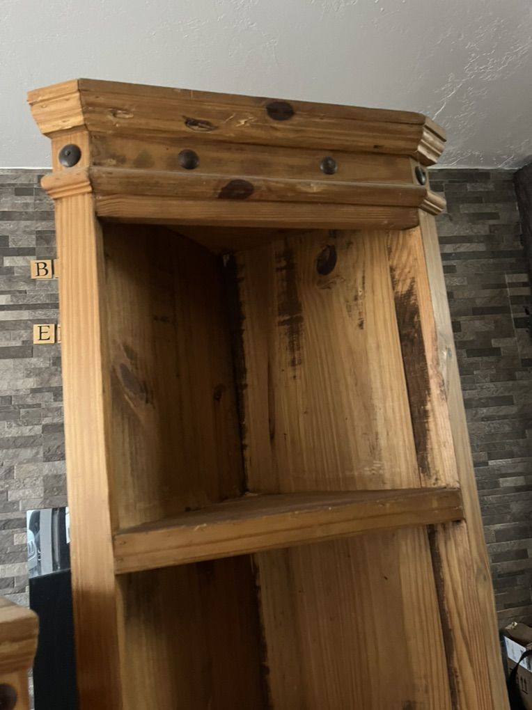 Two corner shelves, solid wood the tall one measures 75“ x 21 and has four shelves smaller 35” x 21 and has three shelves. $50 for both! I love this style but changing decor in my house and no longer works. I also have a smaller wall hanging corner shelf listed check out my other ad.