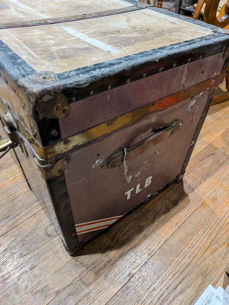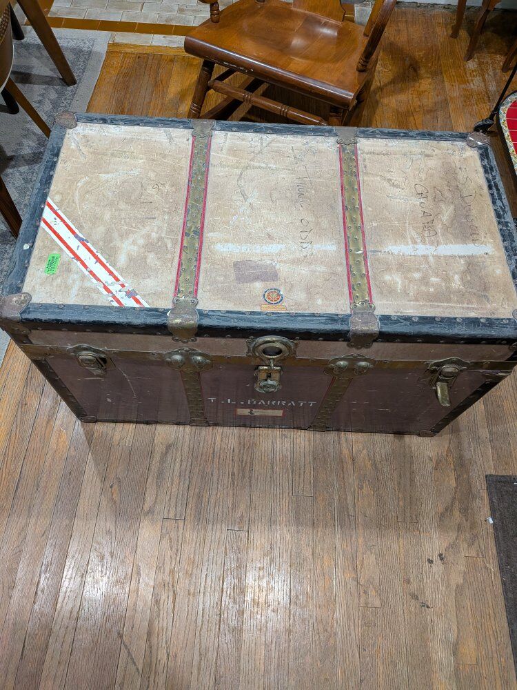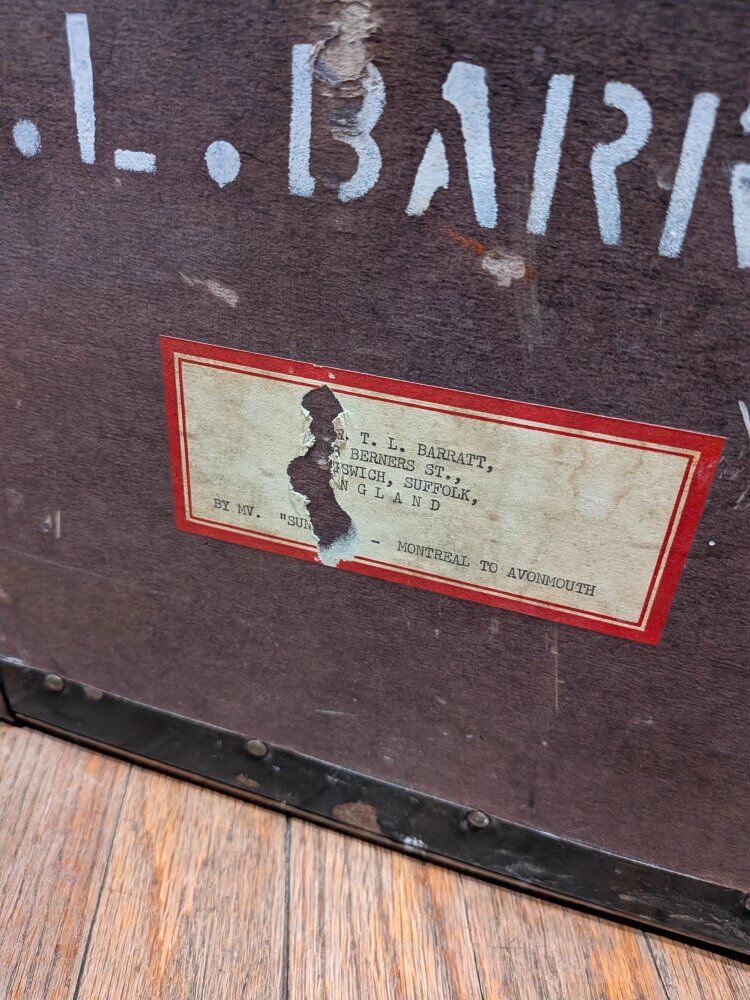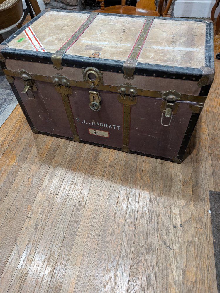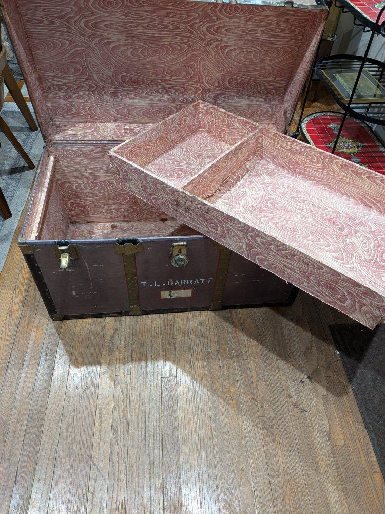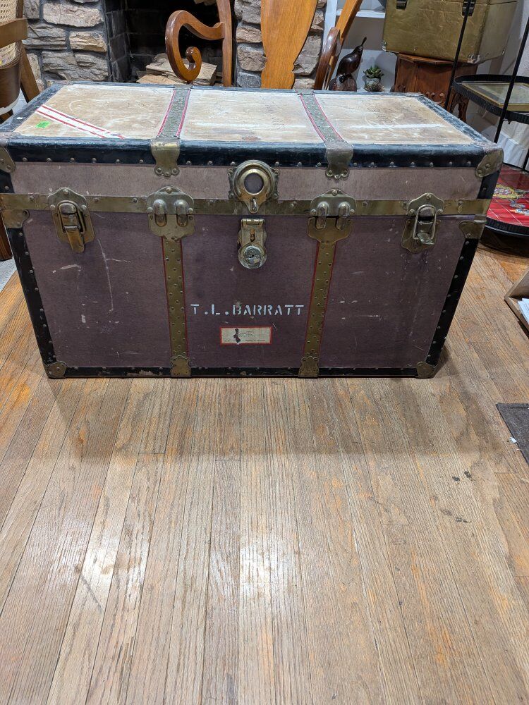 Antique steamer trunk, likely dating from the late 19th or early 20th century, designed for durable travel by train or ship. The name "T.L. BARRATT" is painted on the front, as well as on a sticker that states he is from England. Brass hardware. Some damage on the outside and interior. Measurements in photos.