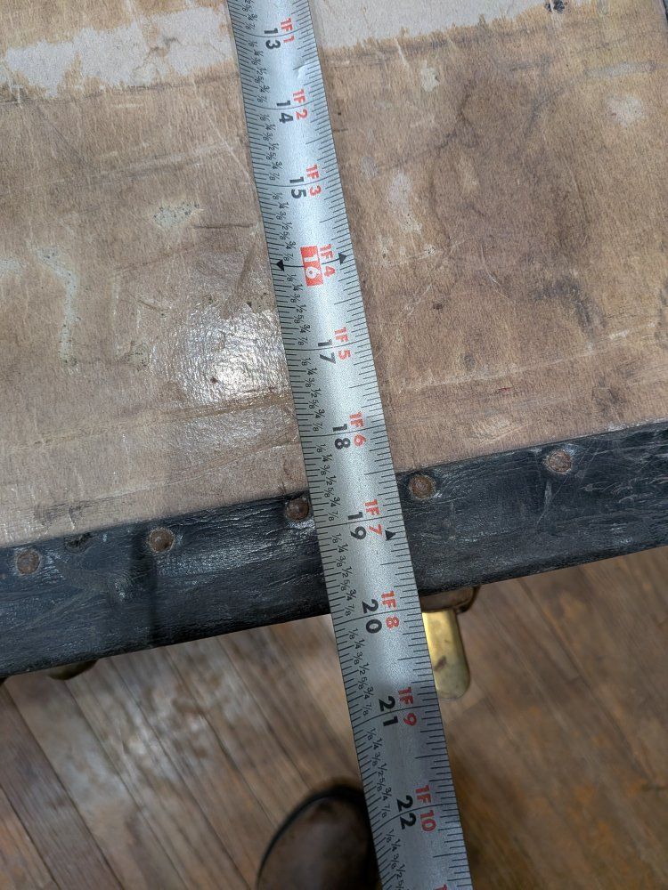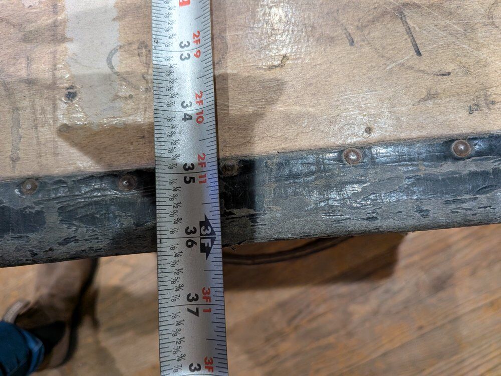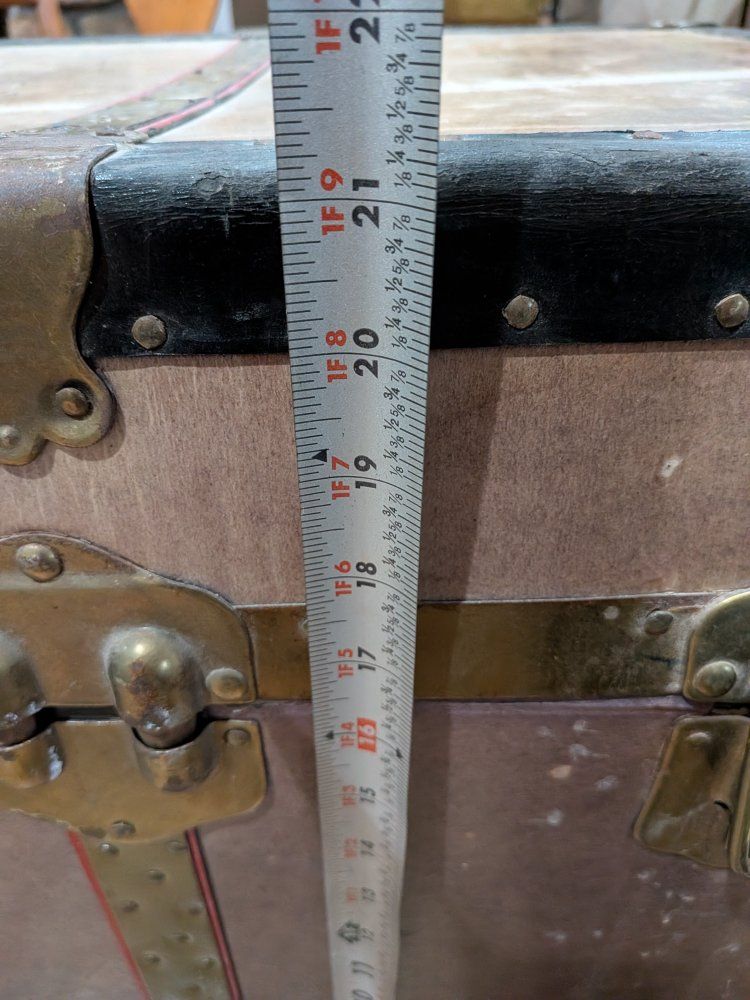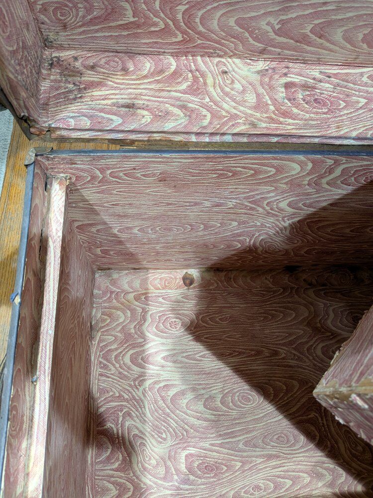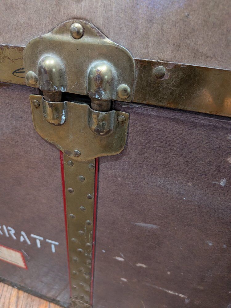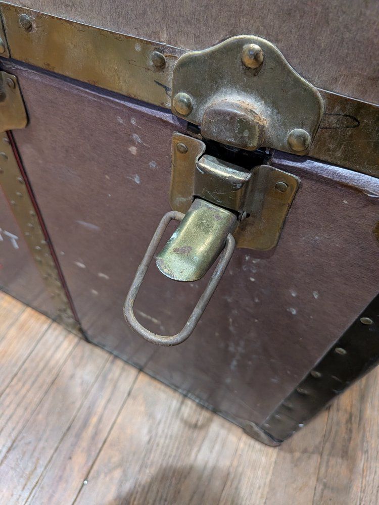 Antique steamer trunk, likely dating from the late 19th or early 20th century, designed for durable travel by train or ship. The name "T.L. BARRATT" is painted on the front, as well as on a sticker that states he is from England. Brass hardware. Some damage on the outside and interior. Measurements in photos.