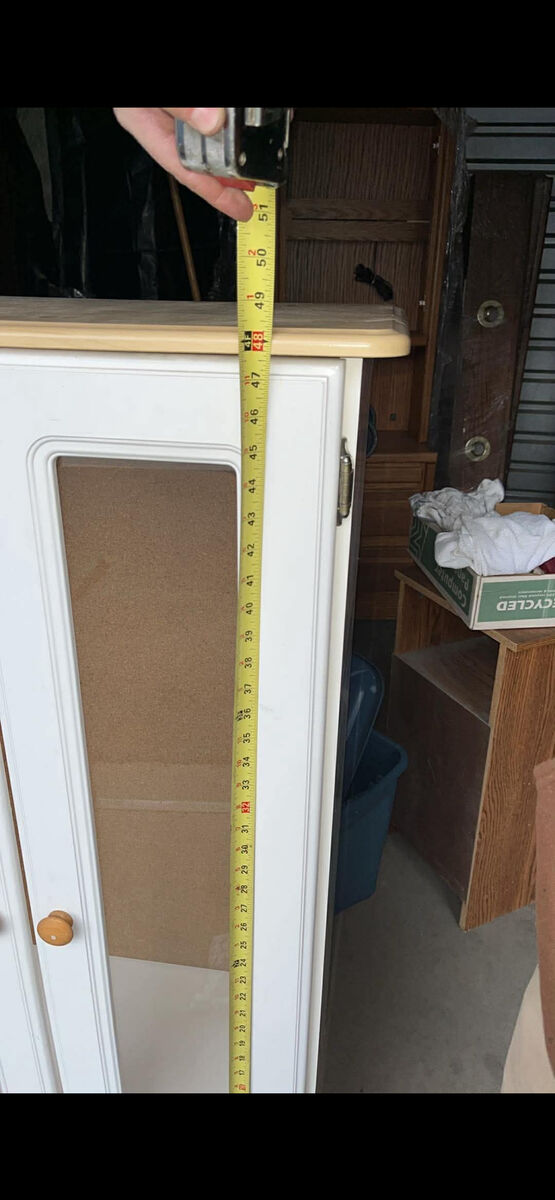 VenmoWhite cabinet with two glass doors and wooden knobs. Comes with extra wood inserts.. Been in storage, but need gone asap.. Throw offers pls.! check other listings :))