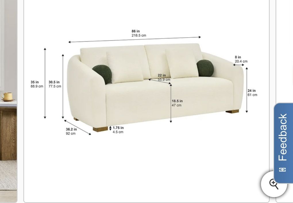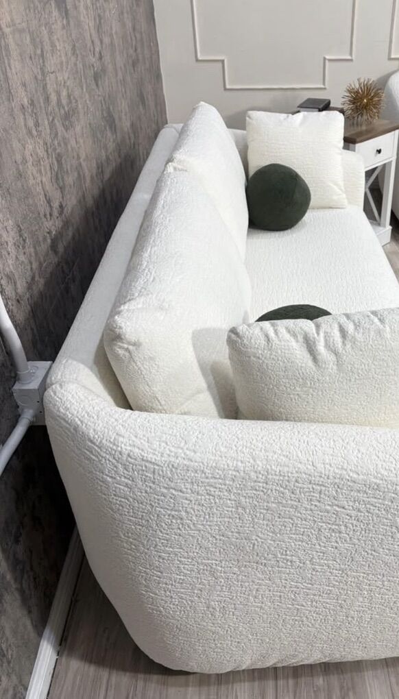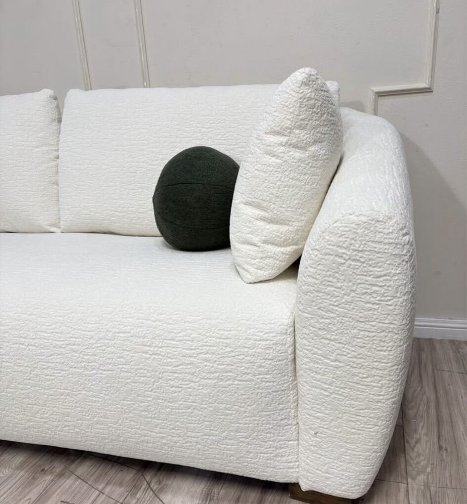 Modern Sofa with Curved Arms Waterfall Seat with Pocket Coil Support 4 Accent Pillows Included Solid Wood Legs Loose, Reversible Back Cushions