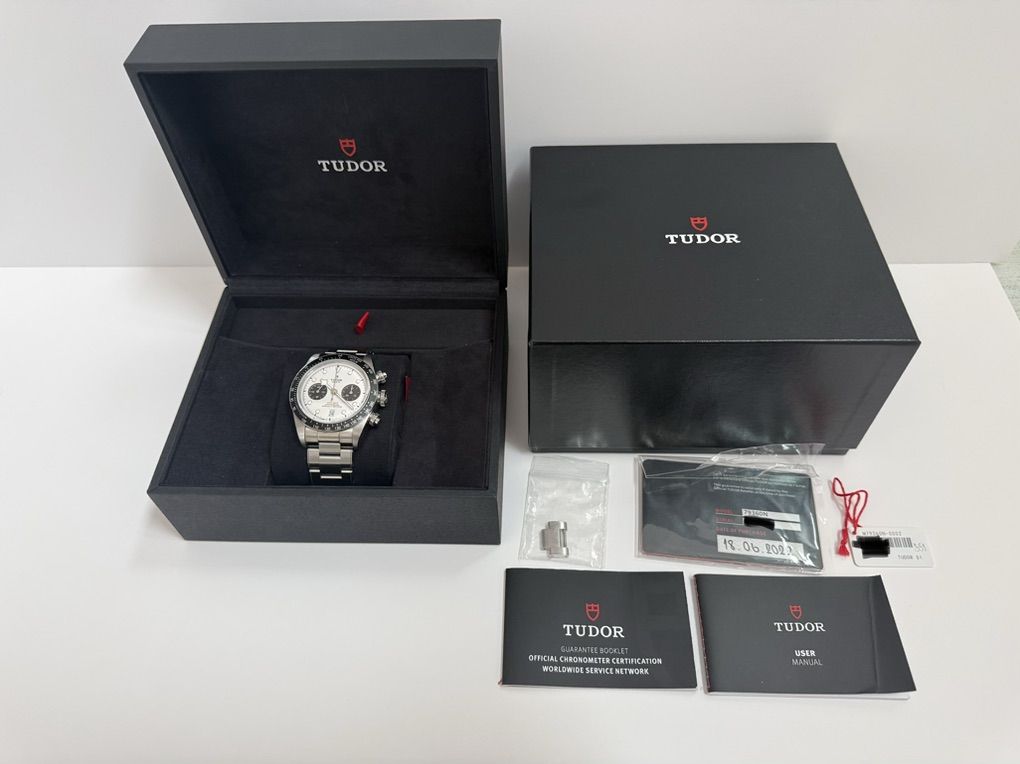 (Full Set): • Tudor Black Bay Chrono Panda on steel riveted bracelet • Outer Black Protective Box • Inner Presentation Box • Warranty Card (Dated 06/2022) • User Manual & Guarantee Booklet • White Serial Hang Tag • Spare Link (Full length bracelet) • Original Purchase Receipt Specifications: • Reference: 79360N • Case Size: 41mm • Movement: Calibre MT5813 (COSC Certified, 70-hour power reserve) • Water Resistance: 200m (660 ft) • Crystal: Domed Sapphire