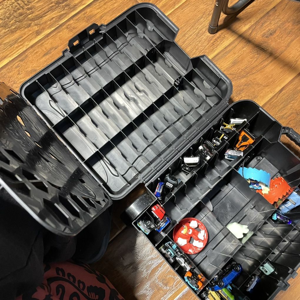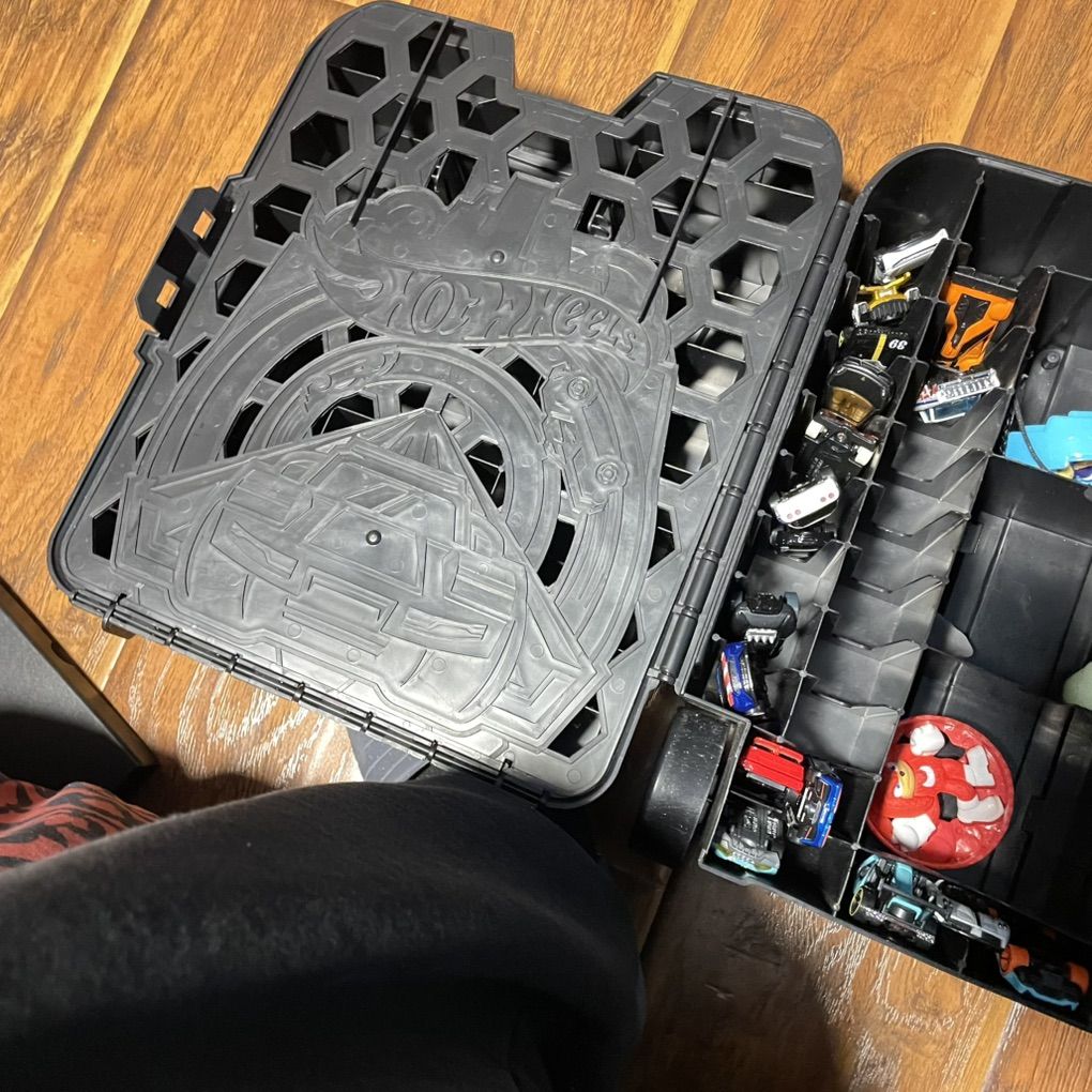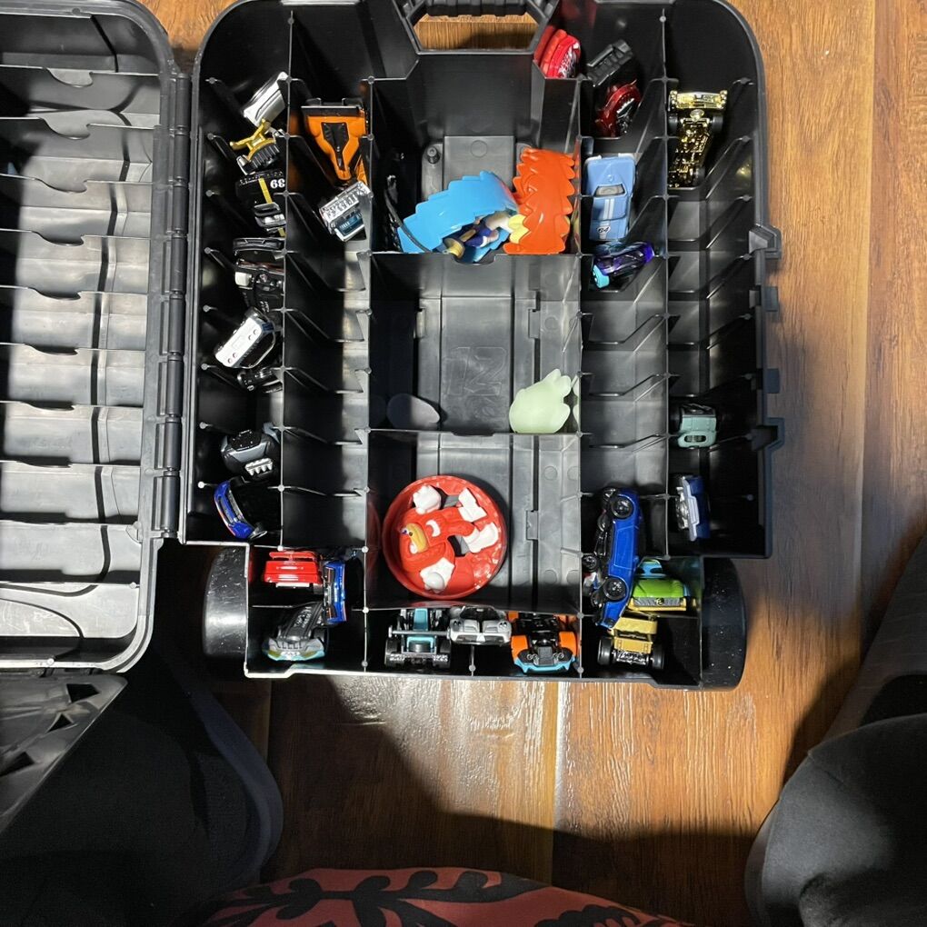 You can store all the messy cars laying around into this roller case. Instead of placing those various cars in bags or zip locks, just make your life easy and use this. My son doesn’t play with the cars much here as most of his stuff is with his mom. Making space in room. Thanks for looking. Selling whatever is in the case along with the carrier.