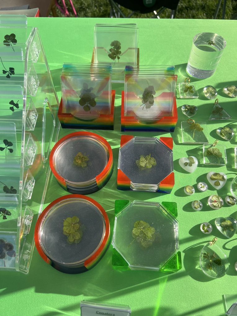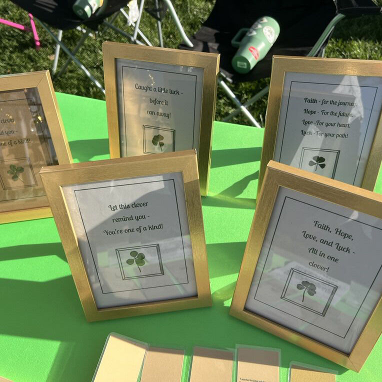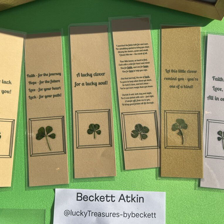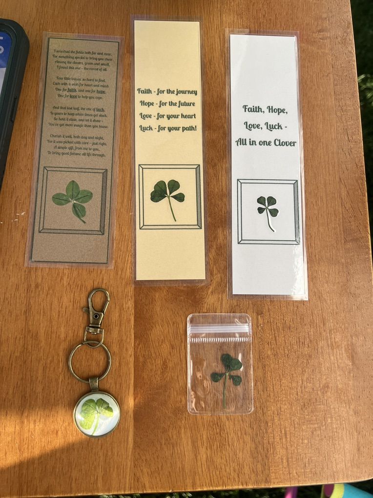 VenmoHi! I’m 10 years old and I love finding four-leaf clovers. With St. Patrick’s Day coming up, I’ve turned real clovers into charms, bookmarks, and coasters to make special good-luck gifts. Each clover is handpicked by me, so every one is unique!