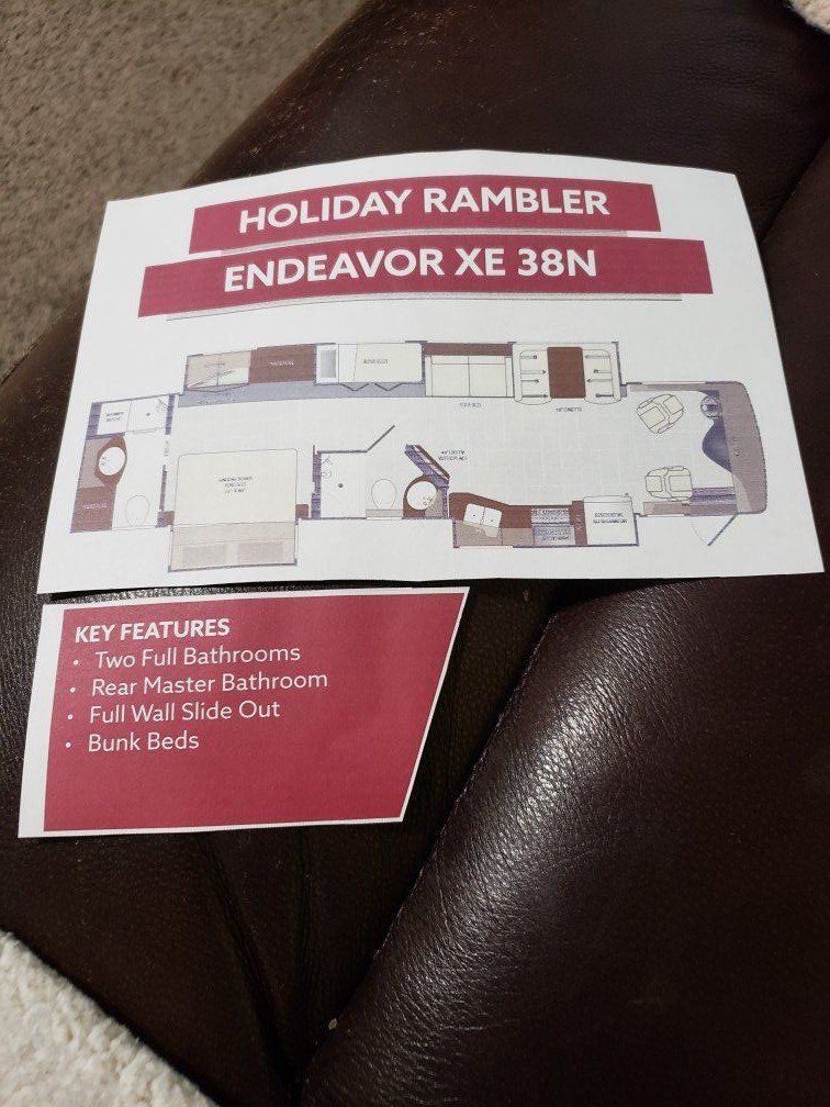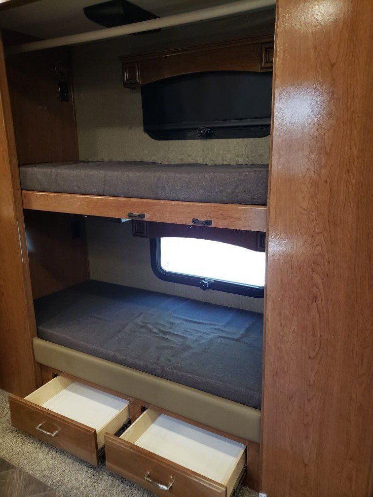 Class A, 360 XCM Diesel Pusher Motorhome 50 AMP Fully electric coach with on demand water and aqua hot system. Electric generator with inside controls on dashboard and access in the bedroom. 360 degree cameras around the coach. Small Awning over door and large full size awning with lights along coach. Lights on outside and in luggage areas with controls by door. 3 slides- kitchen, bedroom and full wall slide on driver's side. King size bed with storage above bed. Full closet with draws in bedroom. Overhead storage and TV above washer & dryer. Washer and dryer enclosed in cabinet in bedroom with folding table/counter above. Bunk beds with DVD players and reading light for each bunk. Top bunk folds up for more room on the bottom. It has a clothes bar so it can be used as a closet. There are 2 drawers under bunks for storage. 2 full bathrooms. Bathroom off bedroom also has a closet and large medicine cabinet and sink area with storage under sink. Bathroom off living area has storage above and below sink. Residential sized Refrigerator with freezer. Pull out pantry next to fridge. Microwave/convection oven. 2 burner induction cook top (will include pans for cooking) Double stainless steel sink with storage above andwindows. Several drawers next to sink and large storage for pans under cooking top. Booth style table with storage draws beneath. More cabinets above dining table. 2 Thomas recliners with heat, cool, massage and cup holders. Fireplace with large TV above it and more cabinets above TV. 2 satellite receivers and DVD player in cabinet above table. Built in King satellite receiver. 2 AC units, electric heater with multiple vents. Electric vents in kitchen and bathroom Central vacuum system Sun and black out shades on all windows. Electric black out shade for front window. Captain chairs swivel for more seating while parked. TV above captain chairs. Electric step cover for traveling. Pass through storage under coach with moveable tray you can access on both sides of coach. Another large storage area full next to pass through. Smaller storage compartments on both sides of coach. Water and sewer hookups with outside shower in it's own compartment.