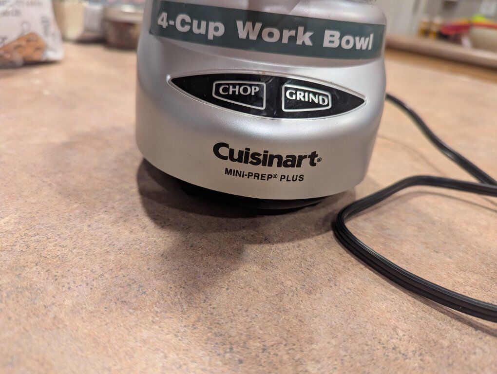ZelleSelling my reliable Cuisinart Mini-Prep Plus 4-cup food processor! This compact and powerful kitchen helper is perfect for all your chopping and grinding needs. Whether you're dicing onions, mincing garlic, chopping herbs, or grinding nuts, this little workhorse gets the job done quickly and efficiently. It features a 4-cup work bowl and easy-to-use "Chop" and "Grind" functions. It's in excellent, gently used condition and works perfectly. Only selling because I'm upgrading to a larger model. Save time on food prep with this fantastic Cuisinart mini chopper! Features: • 4-cup work bowl • Chop and Grind functions • Compact design for easy storage • Powerful motor