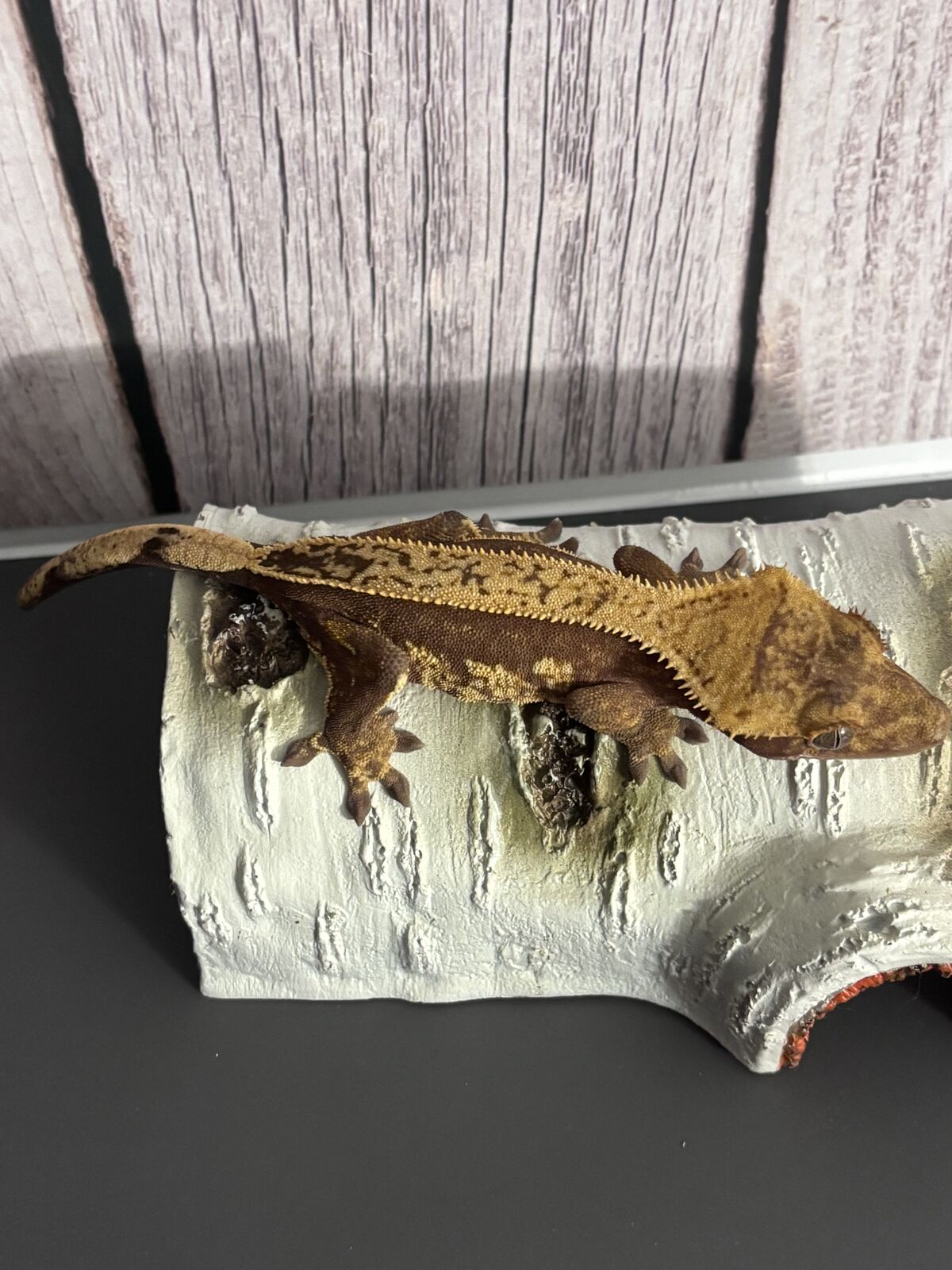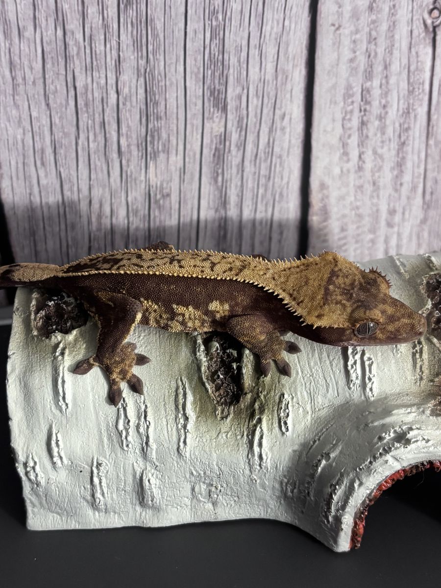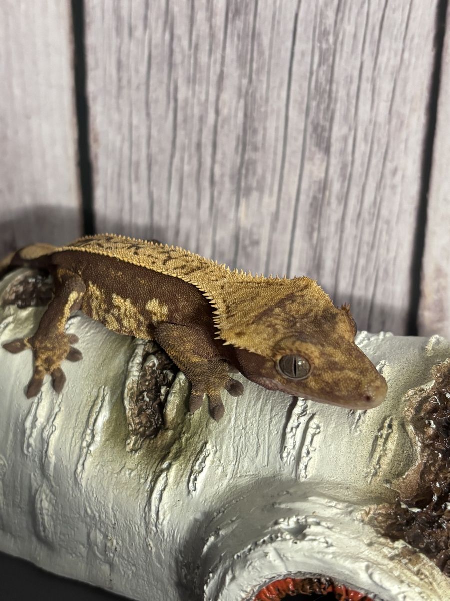 ZelleFemale adult crested gecko, HD 9/20/24. Weight on 2/24 was 24g. Morph is a red full-pin stripe harlequin. She is a bit smaller for her age but is healthy and eating well. She also carries the blushing trait that makes her throat get red when fired up.