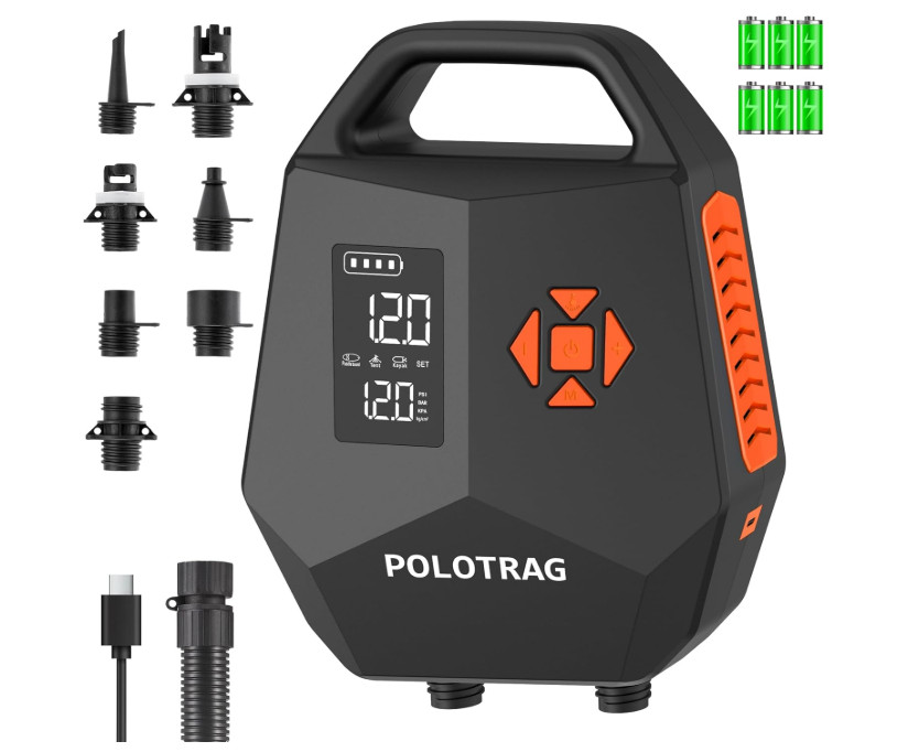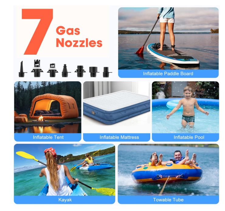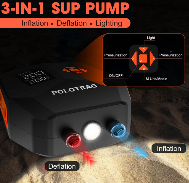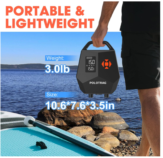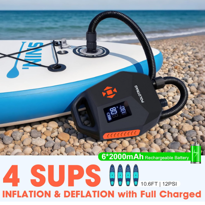 ZellePROFESSIONAL AND POWERFUL INFLATION & DEFALATION: With a maximum pressure of 20 PSI, the paddle board pump electric portable can inflate a 10.5 ft SUP board to 12 PSI in just 6 Mins, saving your time and quickly start the water adventerure. The deflation function helps you save effort when packing it up. LONG RUNTIME: The rechargeable paddle board pump is powered by a built-in 6*2000mAh battery, no need to connect to an external power source during use. And comes with a Type-C charging port. When FULLY CHARGED, it can inflate 4 * 10.5ft SUP boards to 12 PSI.