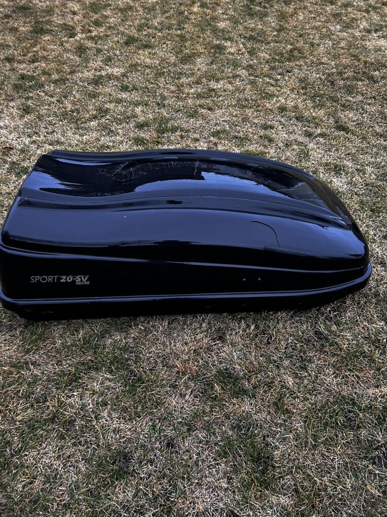 Sears Sport 20-V rooftop cargo box in good condition. Universal fit — works with most vehicles and roof rack crossbars. Great for road trips, skis, camping gear, or extra storage space.