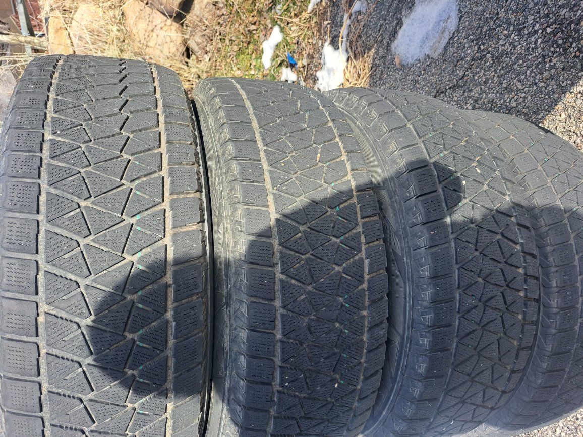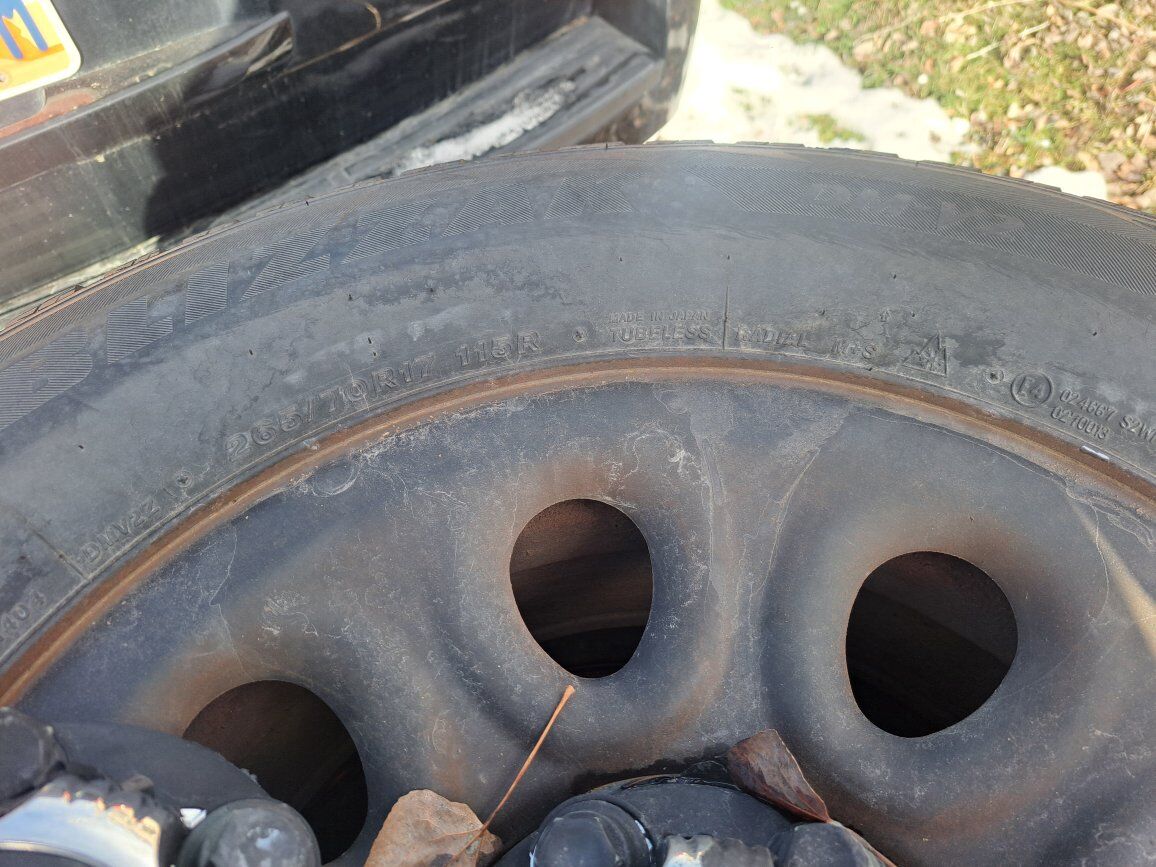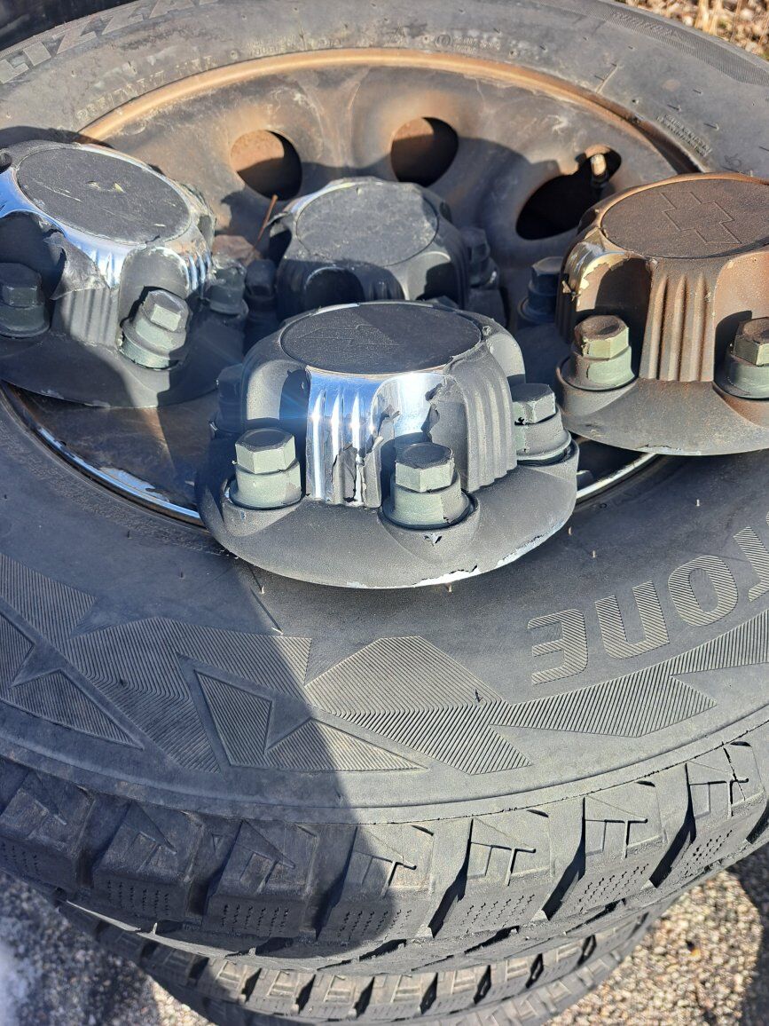 Chevy/GMC Truck/SUV wheels and tires. Wheels and caps are black plastidipped which is peeling. Wheels are chrome underneath. Tires are Bridgestone Blizzak 265/70/17 and tread is 1/4 to 3/8.