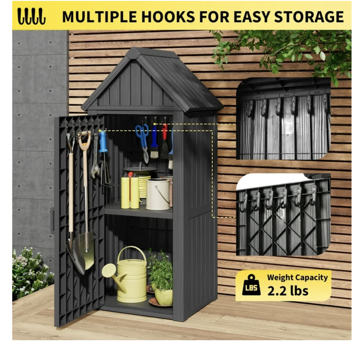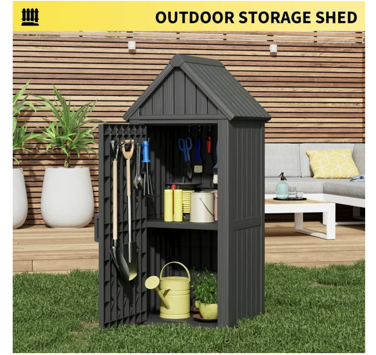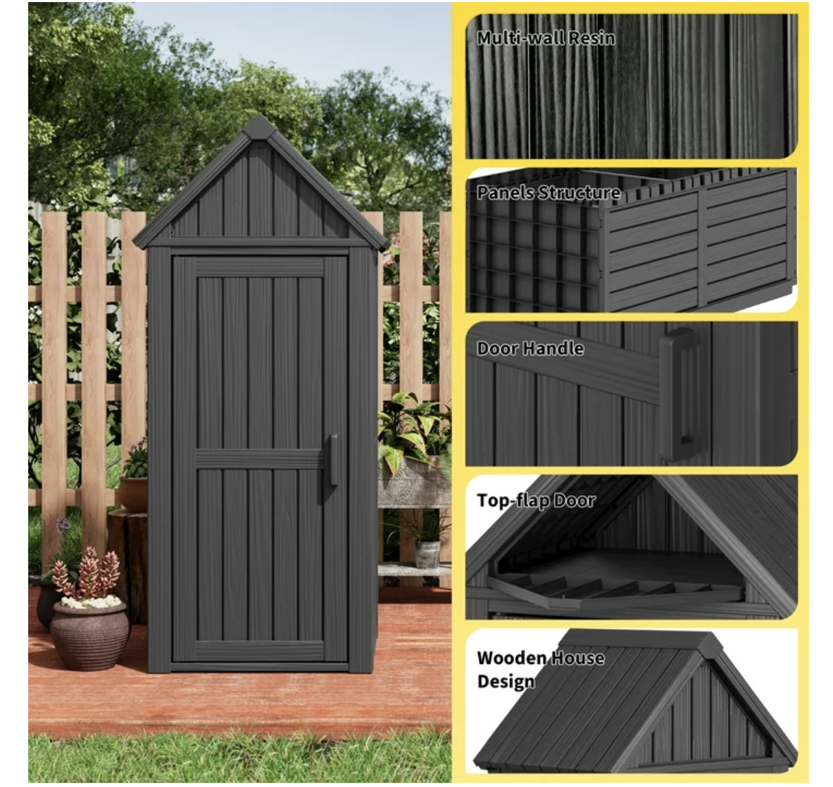Brand new in box, black, unassembled, Outdoor Storage Cabinet - Durable Resin Construction with Reinforced Floor, Adjustable Shelves & Lock for Security (Grey)... 25.79"D x 22.05"W x 64.17"H DURABLE & SAFE RESIN MATERIALConstructed from high-quality resin, this storage shed is safe and odorless, ensuring safety for household use. Its reinforced build resists cracks, fading, and rust, offering reliable performance under sun, rain, or snow — ideal for year-round outdoor storage in gardens, patios, or backyards. Tip: The upgraded lock ring allows you to add a padlock for enhanced security! Weatherproof & Water-Resistant DesignThis shed is made from durable resin, a material that ensures excellent weather protection. The angled design also promotes drainage, preventing water buildup and ensuring your gardening tools, outdoor cushions, and equipment stay completely dry in all weather conditions. Even in heavy snow, the reinforced roof can support up to 110 lbs, so don't worry about snow accumulation. SMART STORAGE SOLUTIONSOffers two fixed storage levels with a removable middle partition for flexible space configuration. The top triangular compartment provides additional storage, while multiple built-in hooks on doors and interior walls allow for organized tool hanging. Perfect for surfboards, garden supplies and other outdoor essentials. SPACE-SAVING DIMENSIONSMeasuring 64.17"H x 25.79"W x 22.05"D, this compact shed fits perfectly in small spaces like patios, balconies or alongside walls. Provides ample organized storage for lawn tools, sports equipment and outdoor accessories. HASSLE-FREE ASSEMBLYDesigned for quick setup with pre-drilled holes, numbered components and comprehensive illustrated instructions. All necessary hardware included - no additional tools required. The lightweight yet sturdy PP construction makes repositioning easy, while doors provide added protection. Most customers complete assembly in under 30 minutes!.. tt052