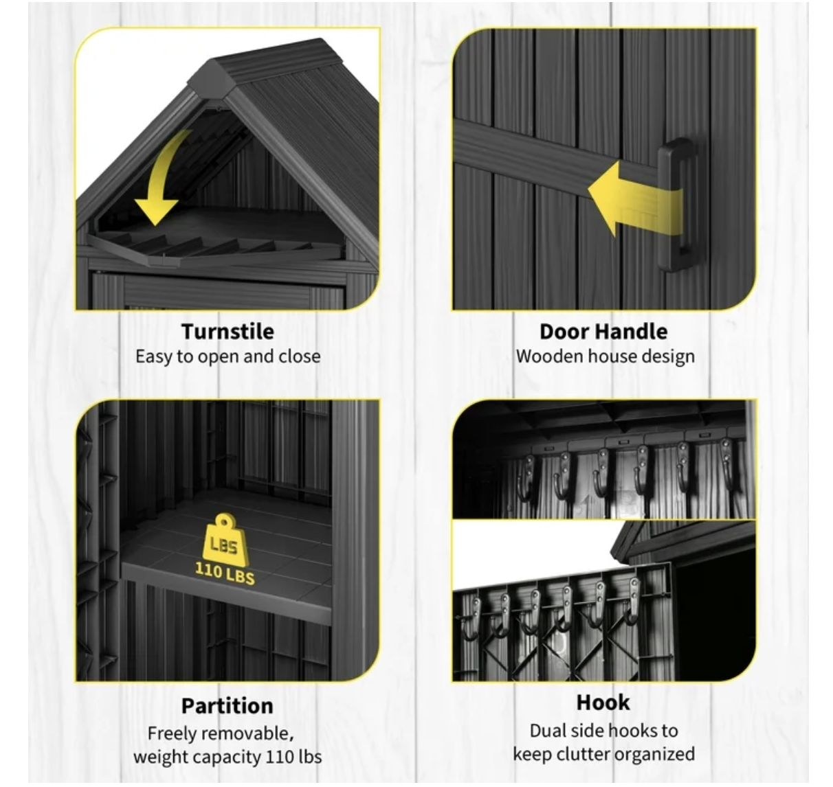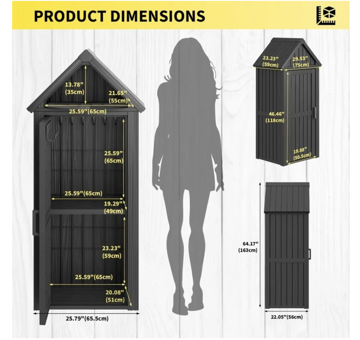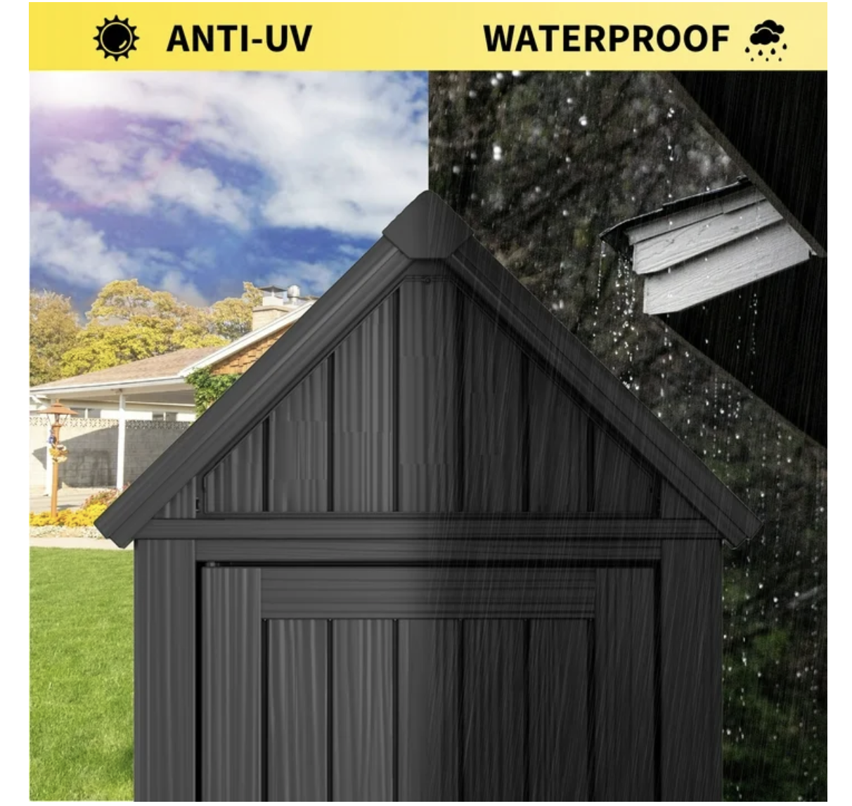 Brand new in box, black, unassembled, Outdoor Storage Cabinet - Durable Resin Construction with Reinforced Floor, Adjustable Shelves & Lock for Security (Grey)... 25.79"D x 22.05"W x 64.17"H DURABLE & SAFE RESIN MATERIALConstructed from high-quality resin, this storage shed is safe and odorless, ensuring safety for household use. Its reinforced build resists cracks, fading, and rust, offering reliable performance under sun, rain, or snow — ideal for year-round outdoor storage in gardens, patios, or backyards. Tip: The upgraded lock ring allows you to add a padlock for enhanced security! Weatherproof & Water-Resistant DesignThis shed is made from durable resin, a material that ensures excellent weather protection. The angled design also promotes drainage, preventing water buildup and ensuring your gardening tools, outdoor cushions, and equipment stay completely dry in all weather conditions. Even in heavy snow, the reinforced roof can support up to 110 lbs, so don't worry about snow accumulation. SMART STORAGE SOLUTIONSOffers two fixed storage levels with a removable middle partition for flexible space configuration. The top triangular compartment provides additional storage, while multiple built-in hooks on doors and interior walls allow for organized tool hanging. Perfect for surfboards, garden supplies and other outdoor essentials. SPACE-SAVING DIMENSIONSMeasuring 64.17"H x 25.79"W x 22.05"D, this compact shed fits perfectly in small spaces like patios, balconies or alongside walls. Provides ample organized storage for lawn tools, sports equipment and outdoor accessories. HASSLE-FREE ASSEMBLYDesigned for quick setup with pre-drilled holes, numbered components and comprehensive illustrated instructions. All necessary hardware included - no additional tools required. The lightweight yet sturdy PP construction makes repositioning easy, while doors provide added protection. Most customers complete assembly in under 30 minutes!.. tt052