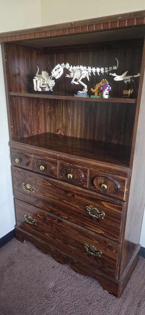 Solid wood. Drawers open. Older but thats when things were made good. Would require at least 2 strong people to carry. Is missing the front glass doors, but as pictures show makes for good shelves. And no the Lego dinos do not come with.