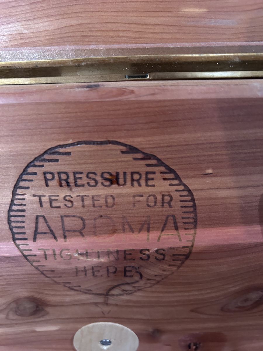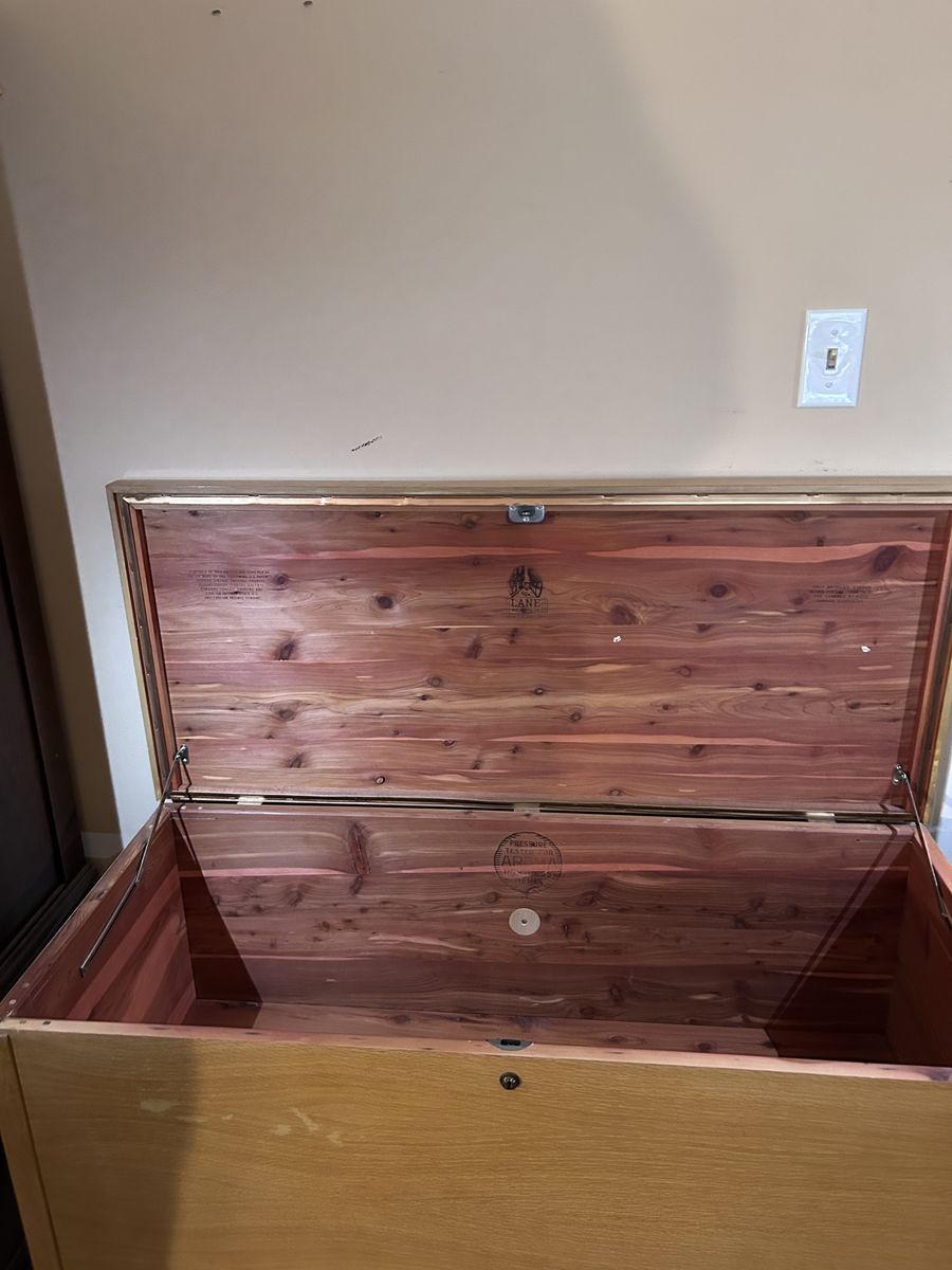 ZelleBlonde wood cedar chest with a drawer. In really good condition. Overall measurements 39wx27h x18.5 Top 13.5 height Drawer 4.5 height
