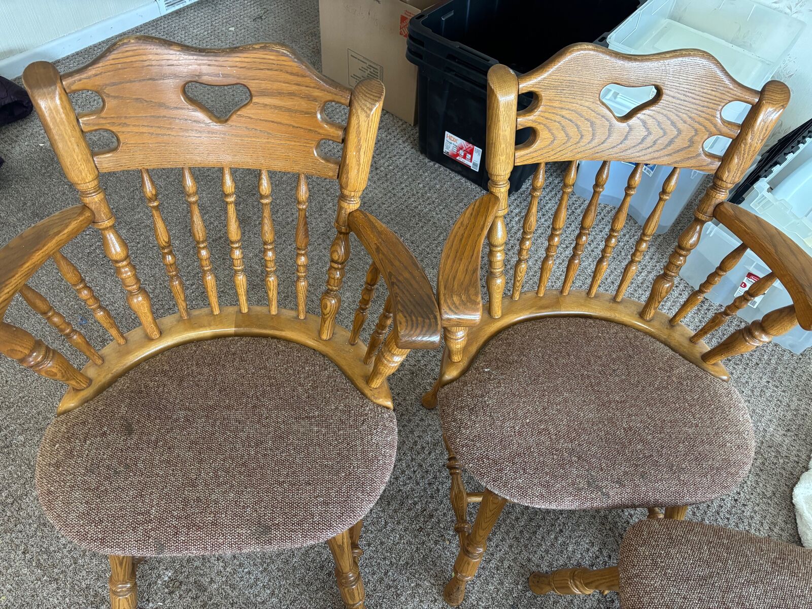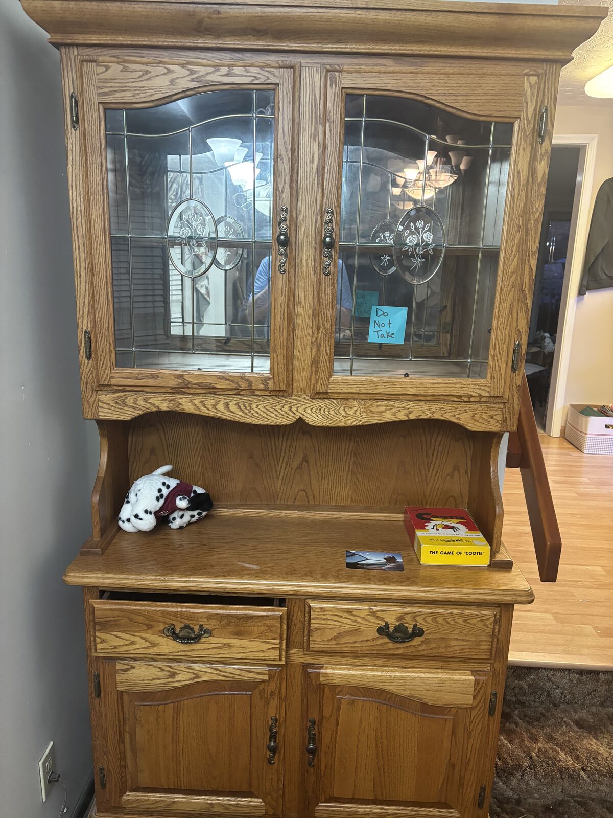 VenmoBeautiful SOLID oak dining set crafted from genuine hardwood — no cheap wood or veneers. Originally purchased from RC Willey, this is a quality-built piece designed to last for generations. The set includes: Solid oak table with substantial, sturdy legs 6 chairs (including 2 armchairs) 2 extension leaves — expands to 8’ feet long Converts down to a smaller round table for flexible seating ( about 4’) Matching hutch with elegant etched glass inserts The table shows general wear consistent with normal use, but the construction is incredibly solid and durable. The “beefy” legs and craftsmanship truly set this apart from modern mass-produced furniture. Estate sale — priced to move. Don’t miss this opportunity to own a timeless, high-quality dining set. It won’t last long!**