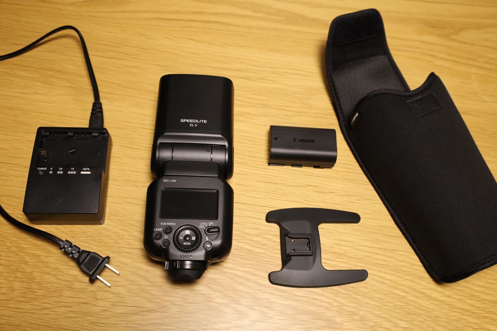 VenmoIncludes flash, carrying case, stand, rechargable battery, and charger.