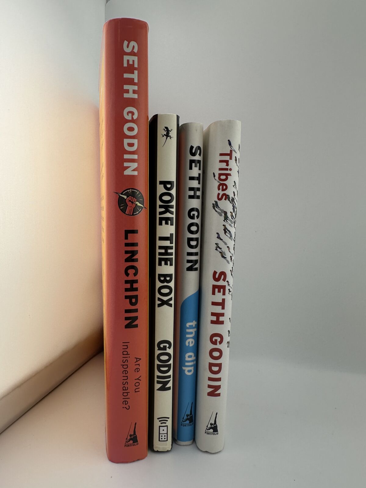 ApplePaySigned first edition Linchpin by Seth Godin plus Tribes, The Dip, and Poke the Box. Hardcover Portfolio editions. Premium entrepreneur leadership bundle.