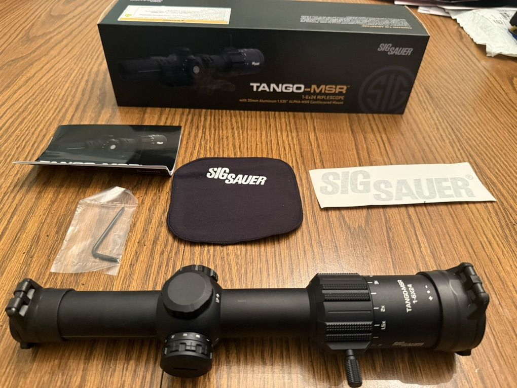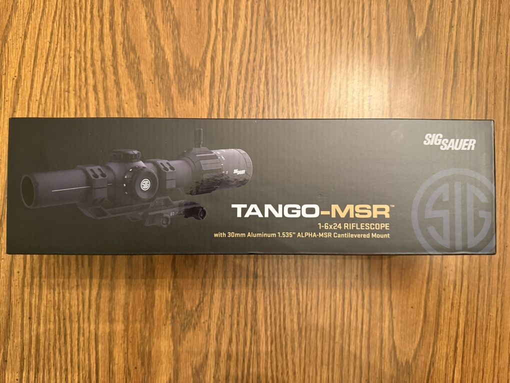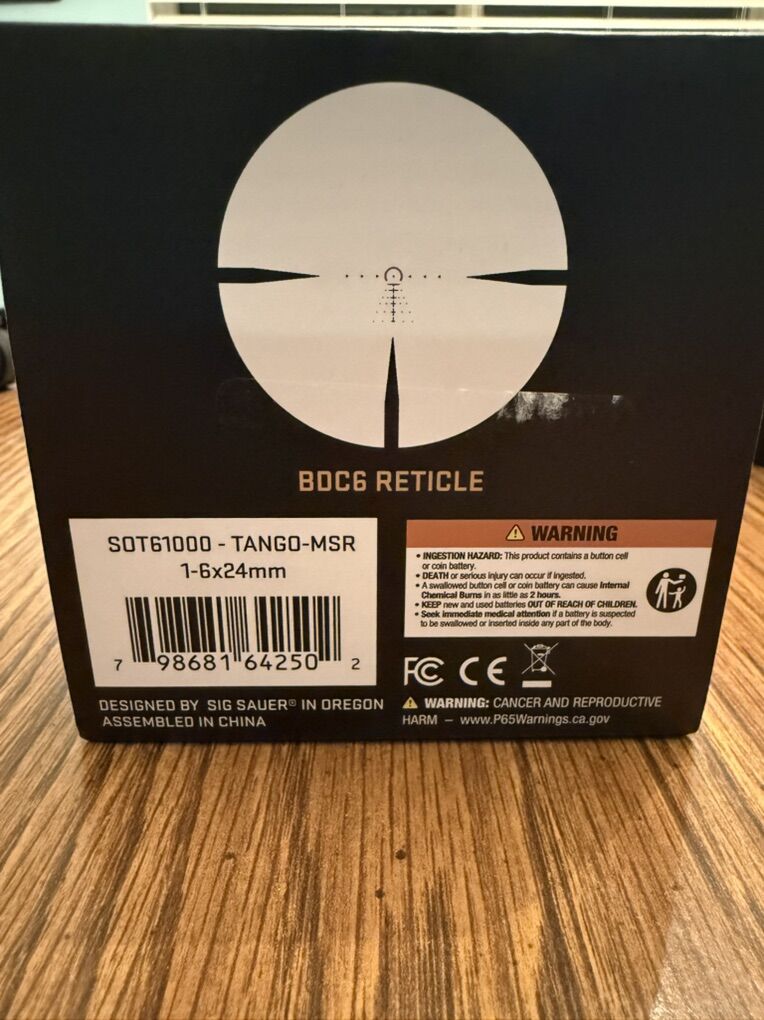 Specifications - Manufacturer: Sig Sauer Model: Tango-MSR (SOT61000) Magnification: 1x – 6x Objective Lens Diameter: 24mm Reticle: MSR-BDC6, Red Illuminated (11 brightness levels) Focal Plane: Second Click Value: 0.5 MOA Eye Relief: 3.3 Tube Diameter: 30mm Turrets: Capped, 0.5 MOA adjustments Length: 11.25 Weight: 1.24 lbs (scope only) Color: Matte Black Turret Direction: Counter-Clockwise (CCW) Condition: Lightly Used