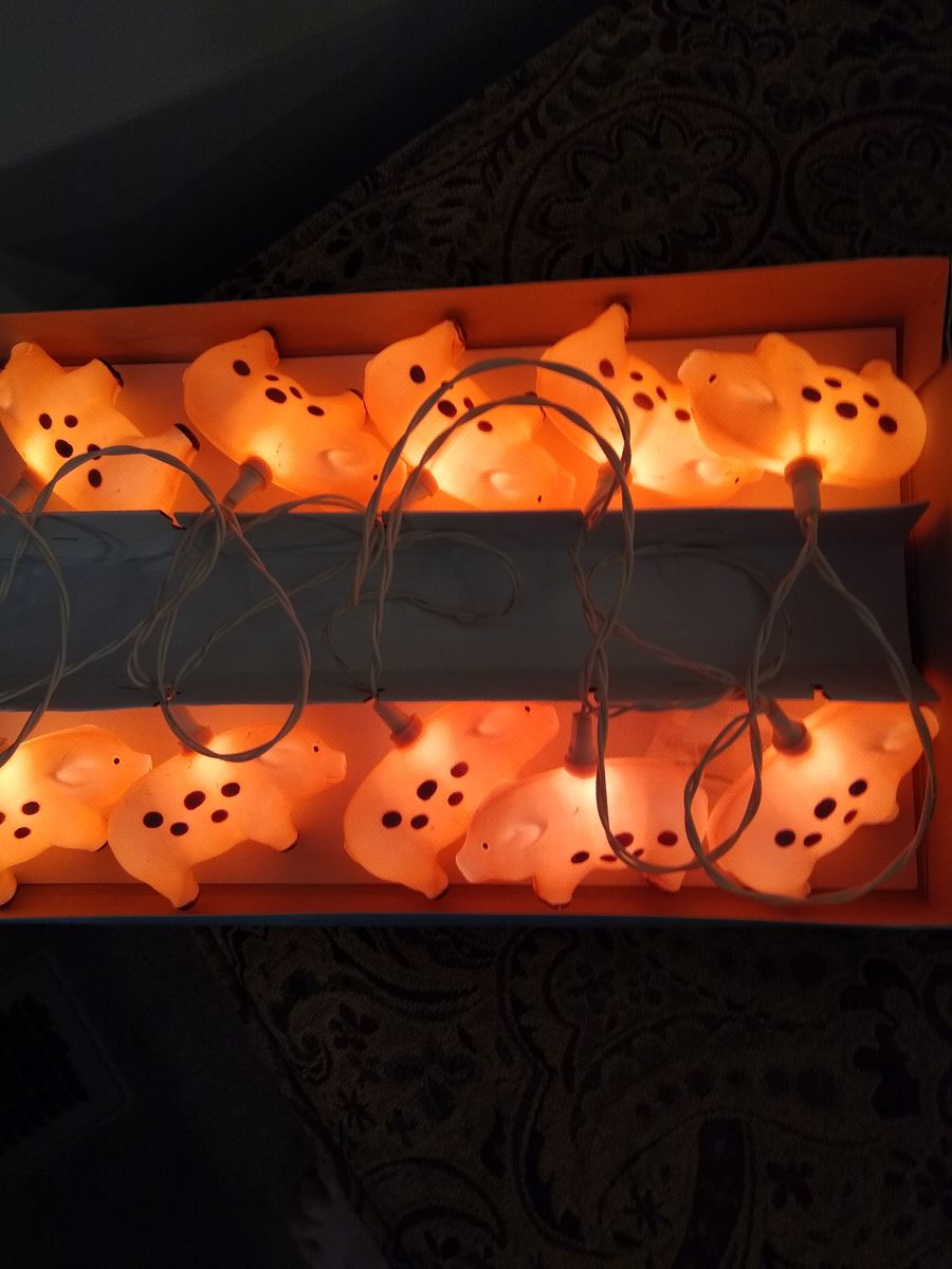 String of 10 cute 'Little Piggies’ indoor/outdoor decorative lights. 10-feet long. Includes sparebulbs. Cash only please.