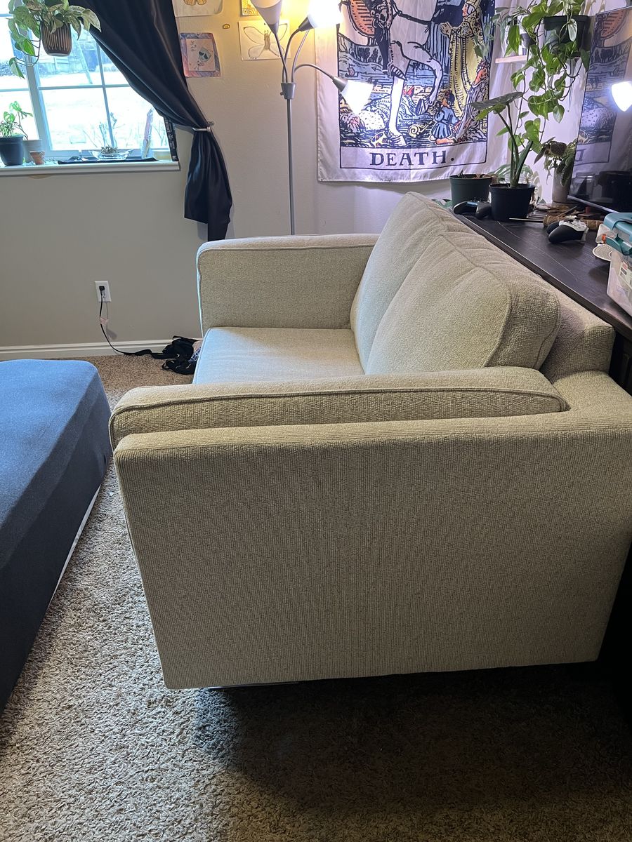 ApplePayHardly used white love seat, extremely comfortable! L-5’6” W-3’ H-2’6” The cushions and pillows are removable and covers are washable. Wooden leg are also removable!
