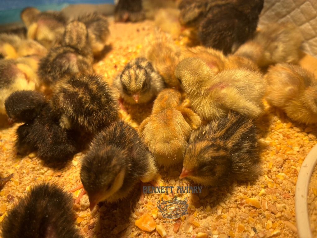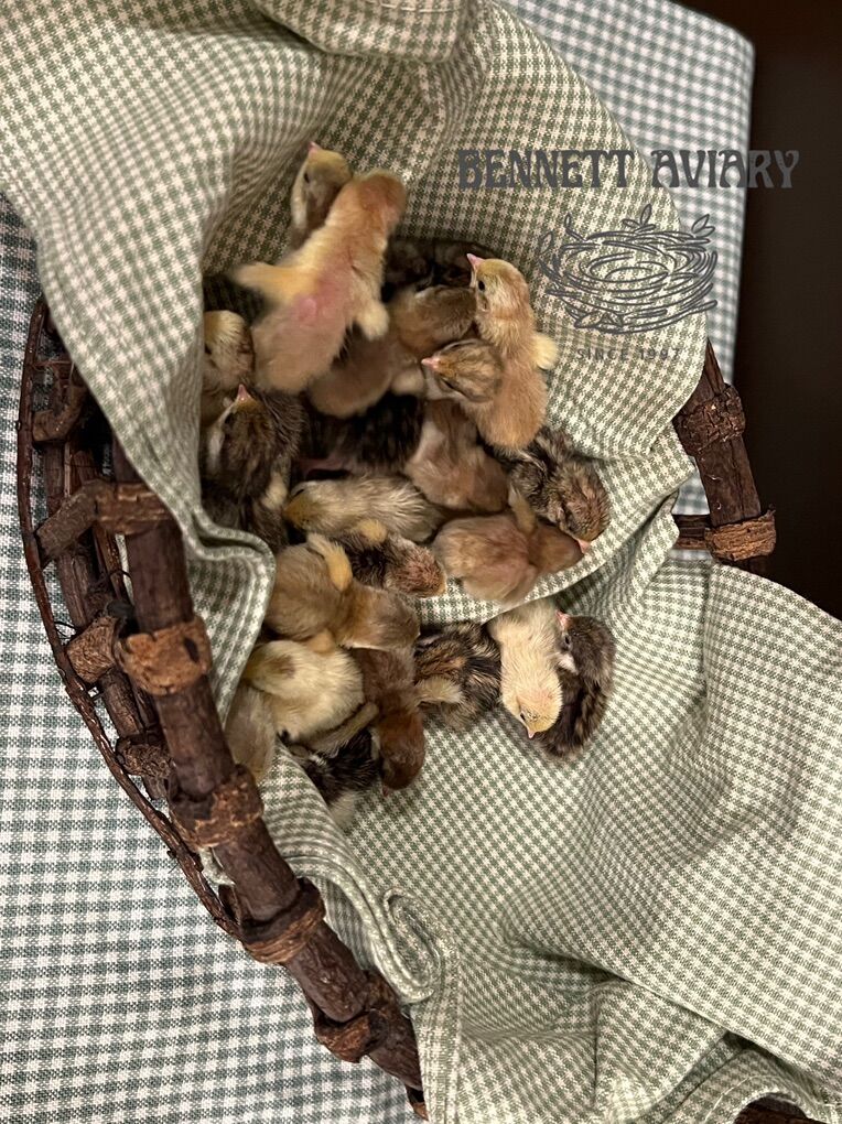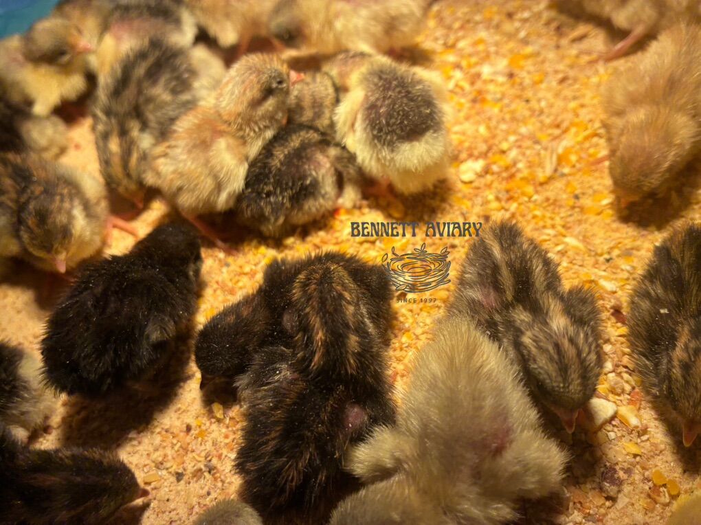 I have tons of Button Quail chicks available. Hatched just today, February 24. They are all eating and drinking great and ready to go to their new homes. There is every color variation possible available. The parents are from well mixed bloodlines imported from at least six different locations nationwide. Button quail are TINY. They are the world’s smallest quail. They make great indoor or outdoor pets, and are surprisingly very cold hardy. They do well in small spaces or in mixed collections. They do just fine with other birds and are great in large numbers. They are incredibly easy to breed and lay one egg every day. Button quail are known for being great docile pets. They grow up very fast and reach sexual maturity as soon as three months of age. Last two pictures are of the button quail color chart, and a picture for size comparison next to a US Dime.
