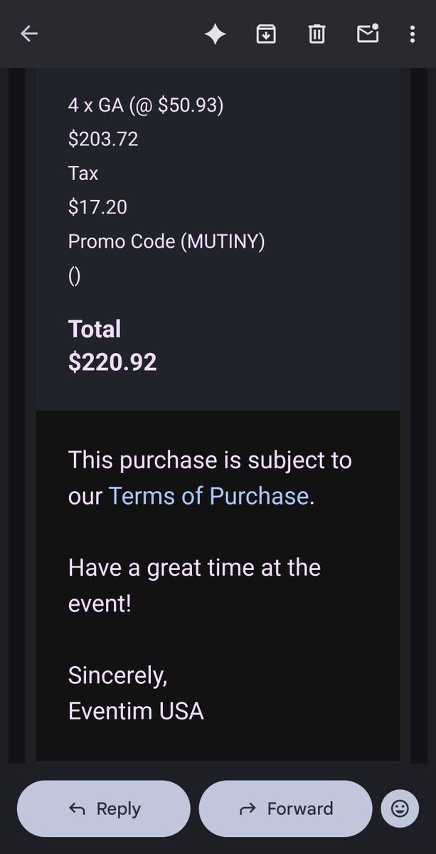 4 x GA (@ $50.93) $203.72 Tax $17.20 Promo Code (MUTINY) () Total $220.92