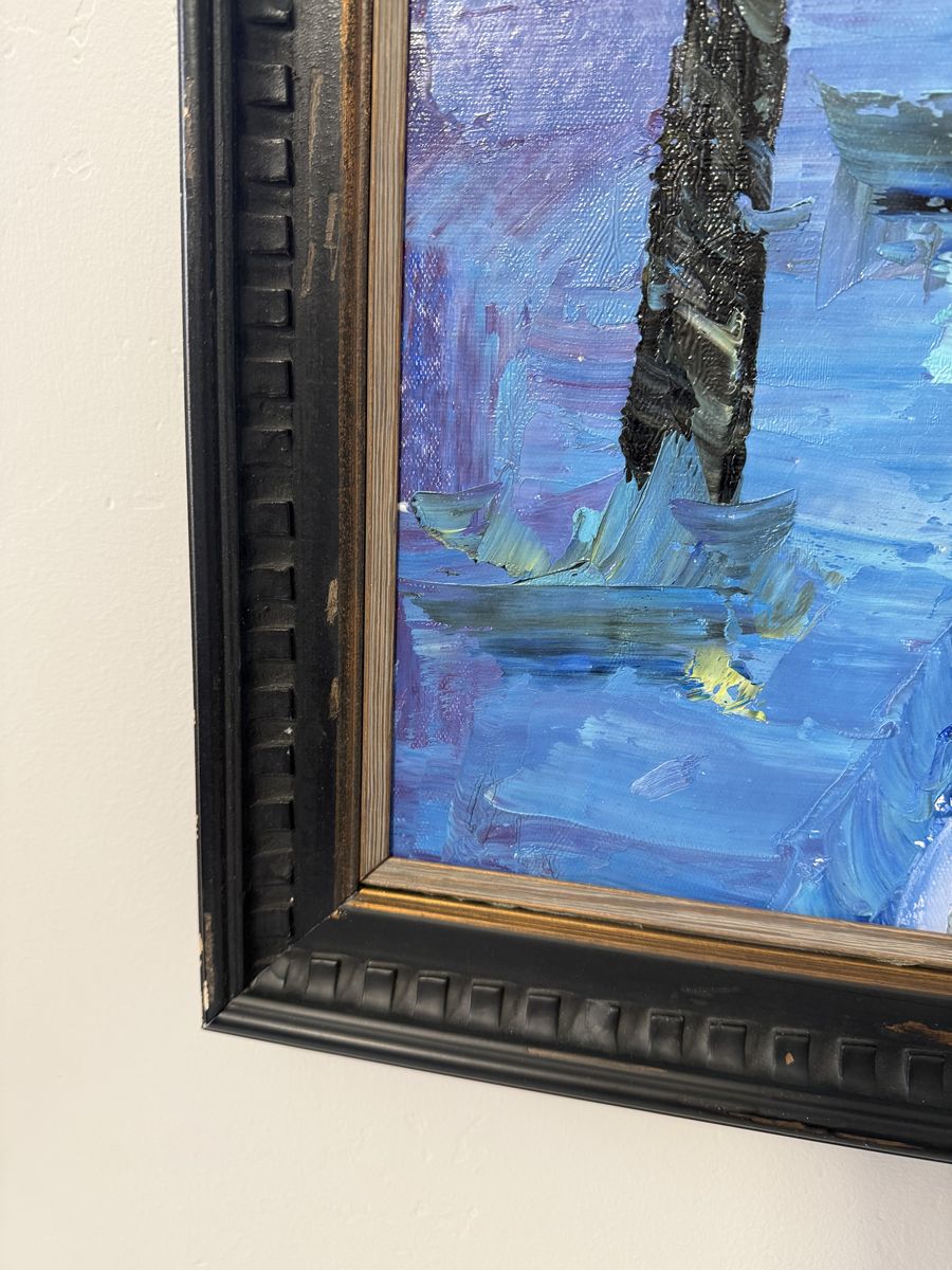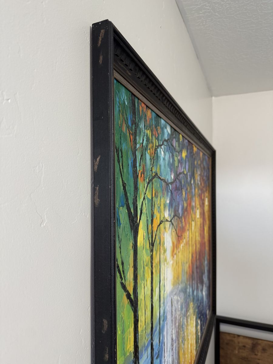 VenmoLarge framed canvas painting 39”H x 51”W (approx 3ft x 4ft) Palette knife painting with distressed black frame.