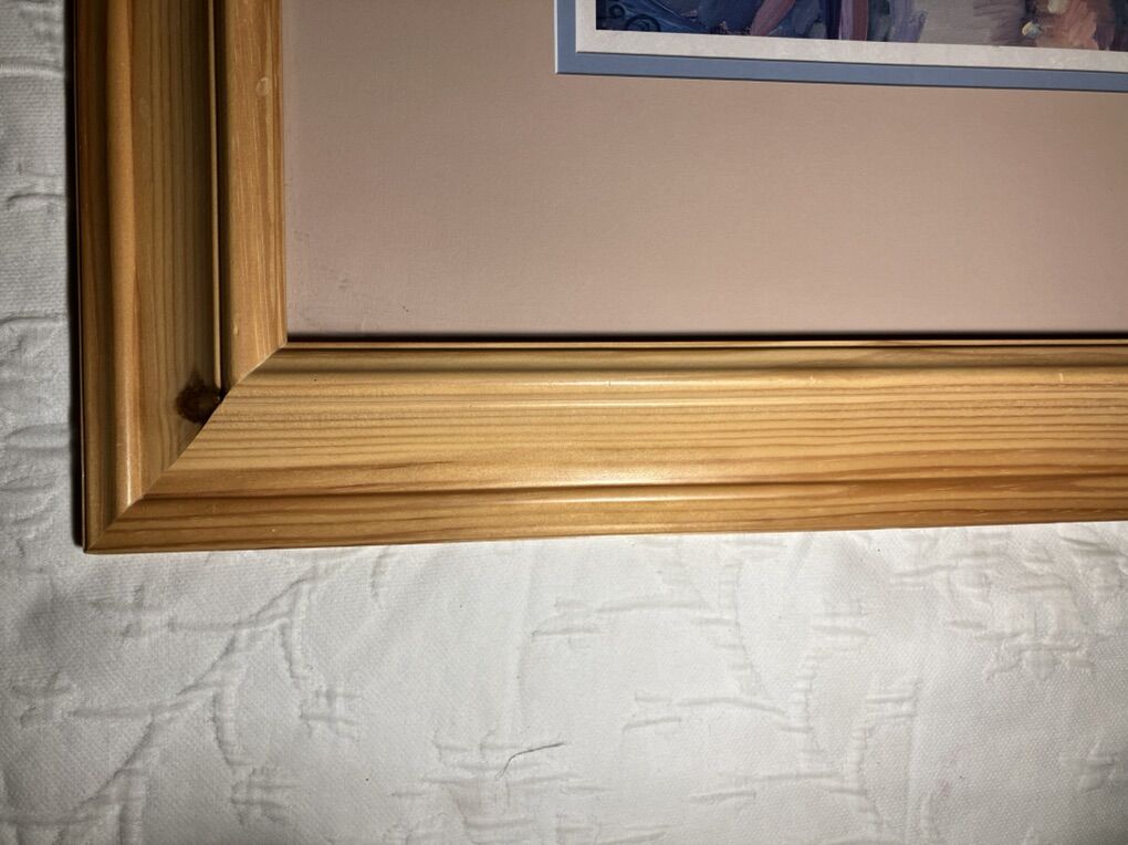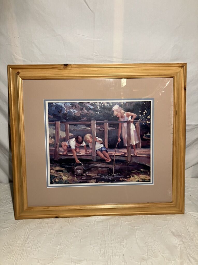 Charming art print. Kids playing by dock. Natural wood frame and light brown matting. Comes ready to hang. Measurements
