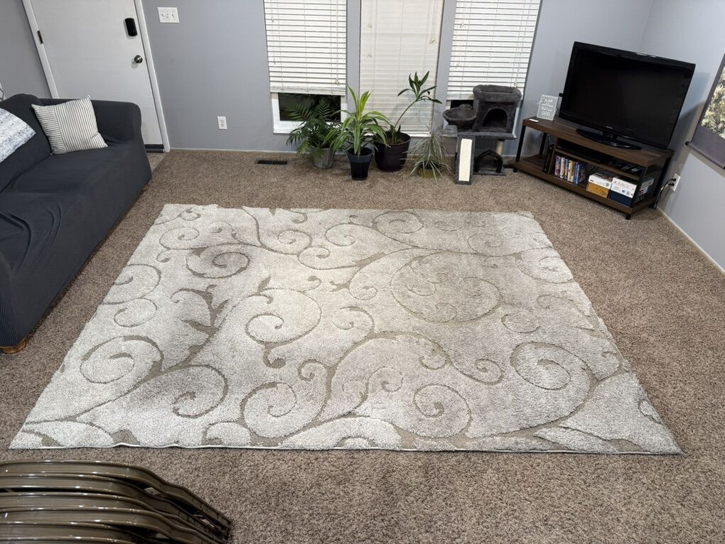 Large 8’ x 10’ area rug — perfect for a living room, bedroom, or basement space.