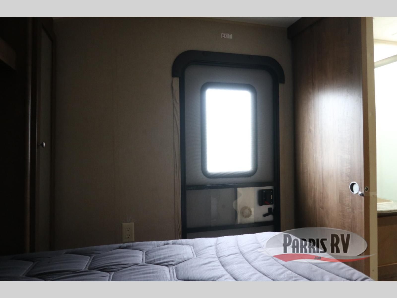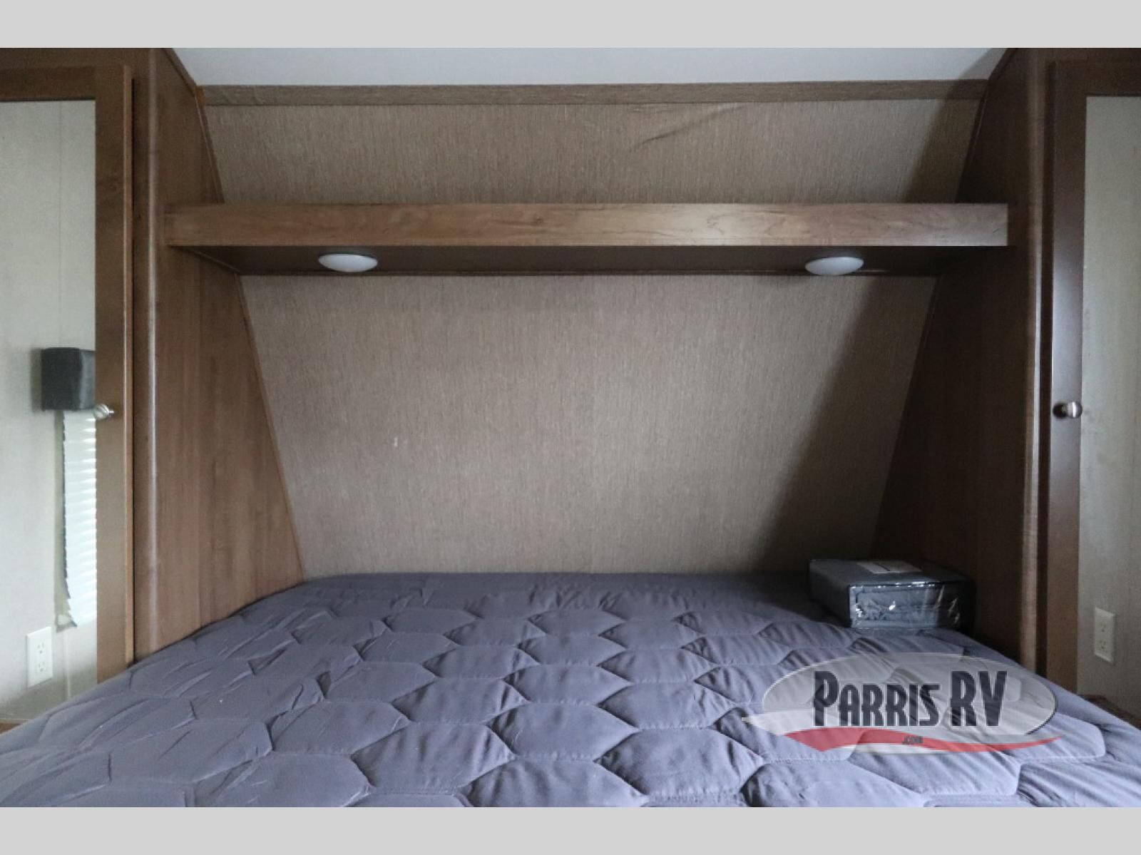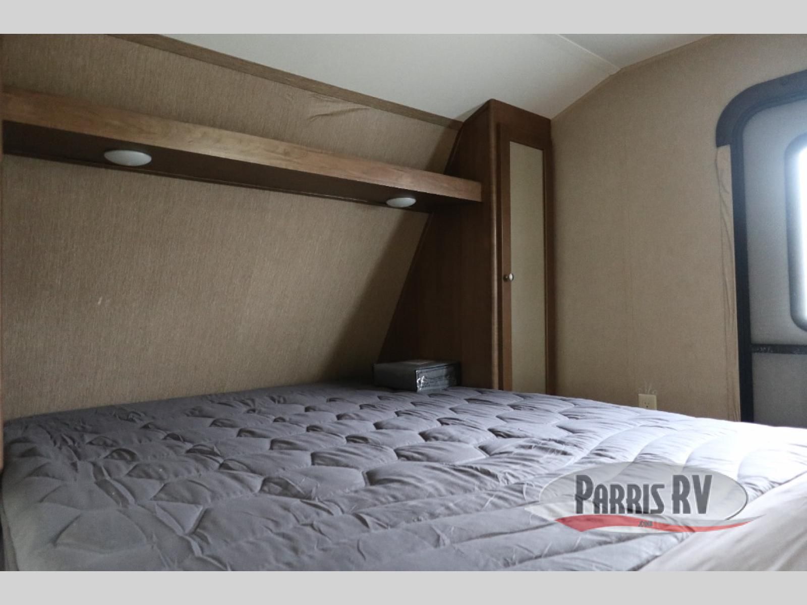The front features a private bedroom with separate entry from outside. There is a queen bed with shirt closets on both sides and a overhead shelf. Under the bed you will find a pass thru storage, and outside of the trailer there is a mega storage and so much more!