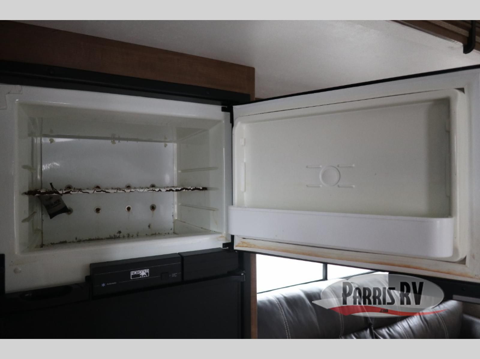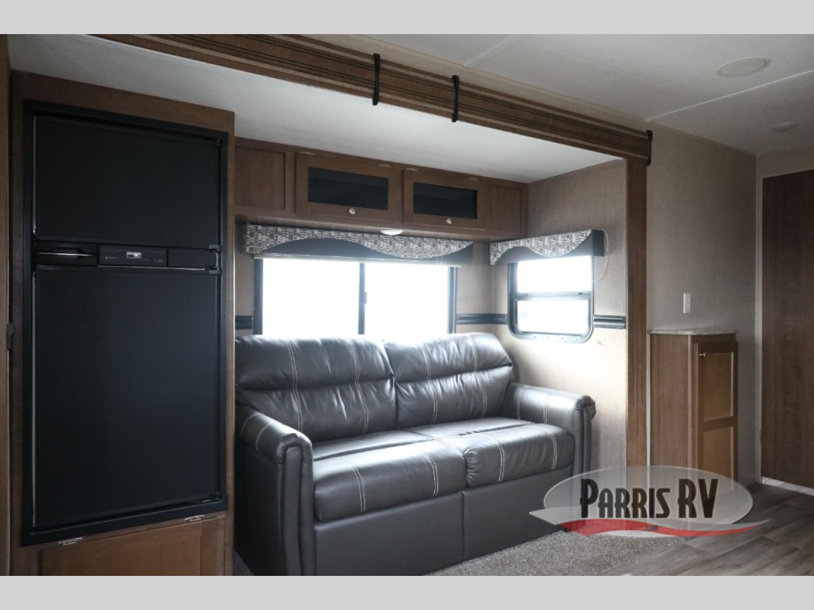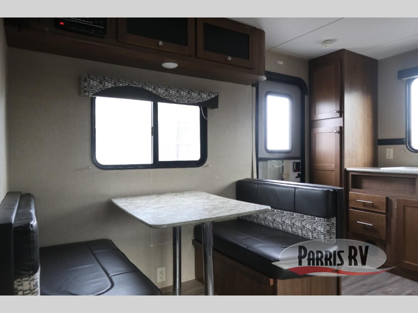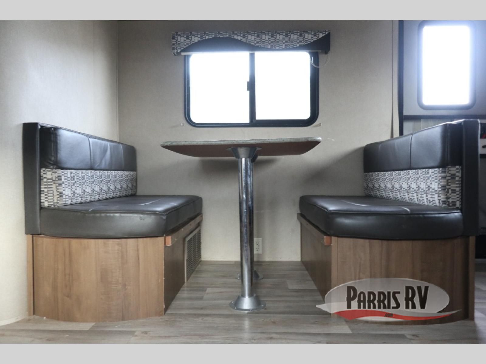 Step inside the rear most entry door and find yourself in the kitchen. There is a pantry, double kitchen sink, 3 burner range and microwave along the rear wall. The refrigerator is off to the side in the single slide out with a 68" sofa. There is a dinette just inside the entry door on the right.