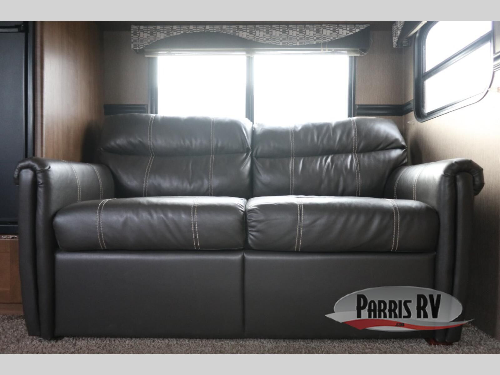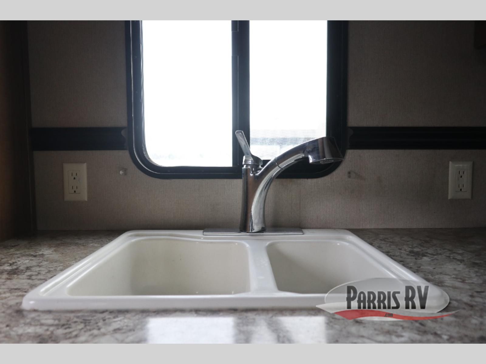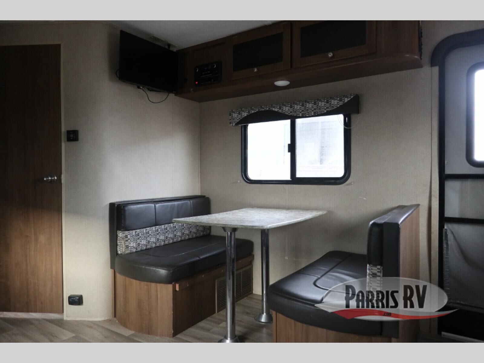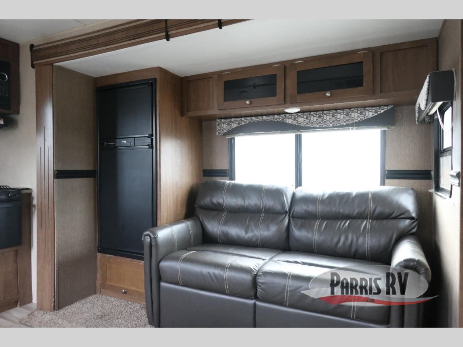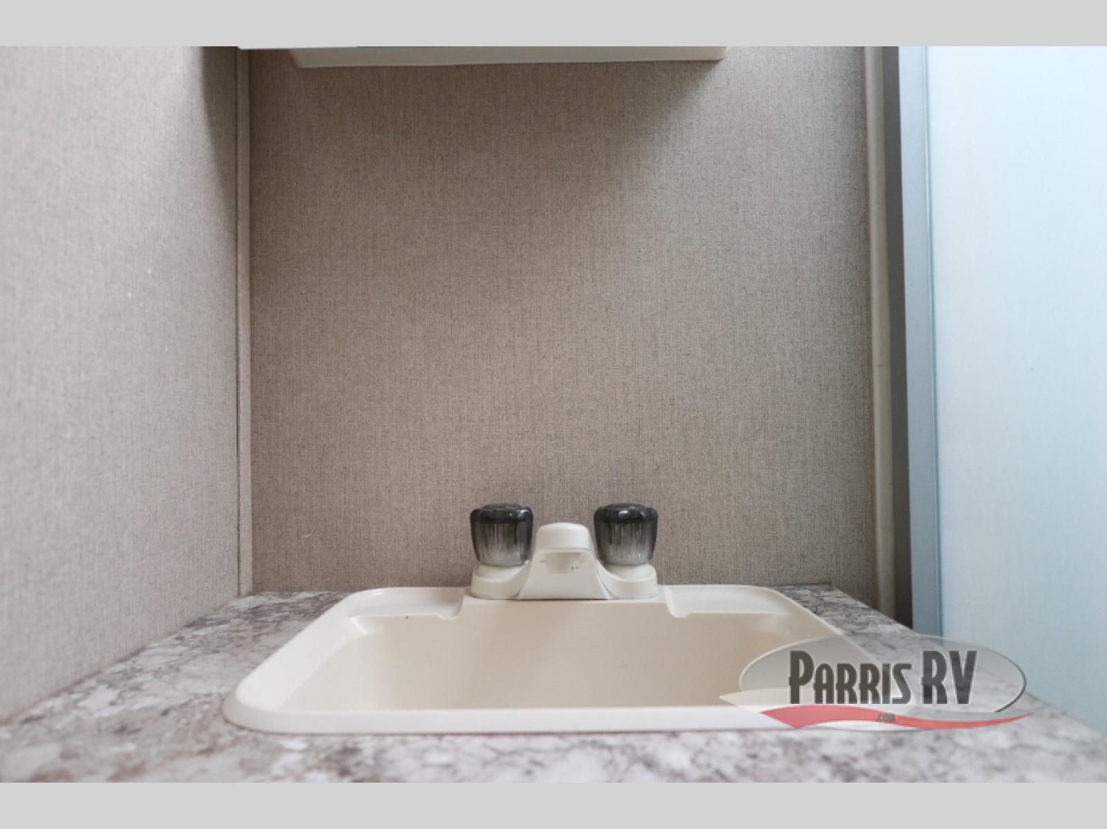 Step inside the rear most entry door and find yourself in the kitchen. There is a pantry, double kitchen sink, 3 burner range and microwave along the rear wall. The refrigerator is off to the side in the single slide out with a 68" sofa. There is a dinette just inside the entry door on the right.