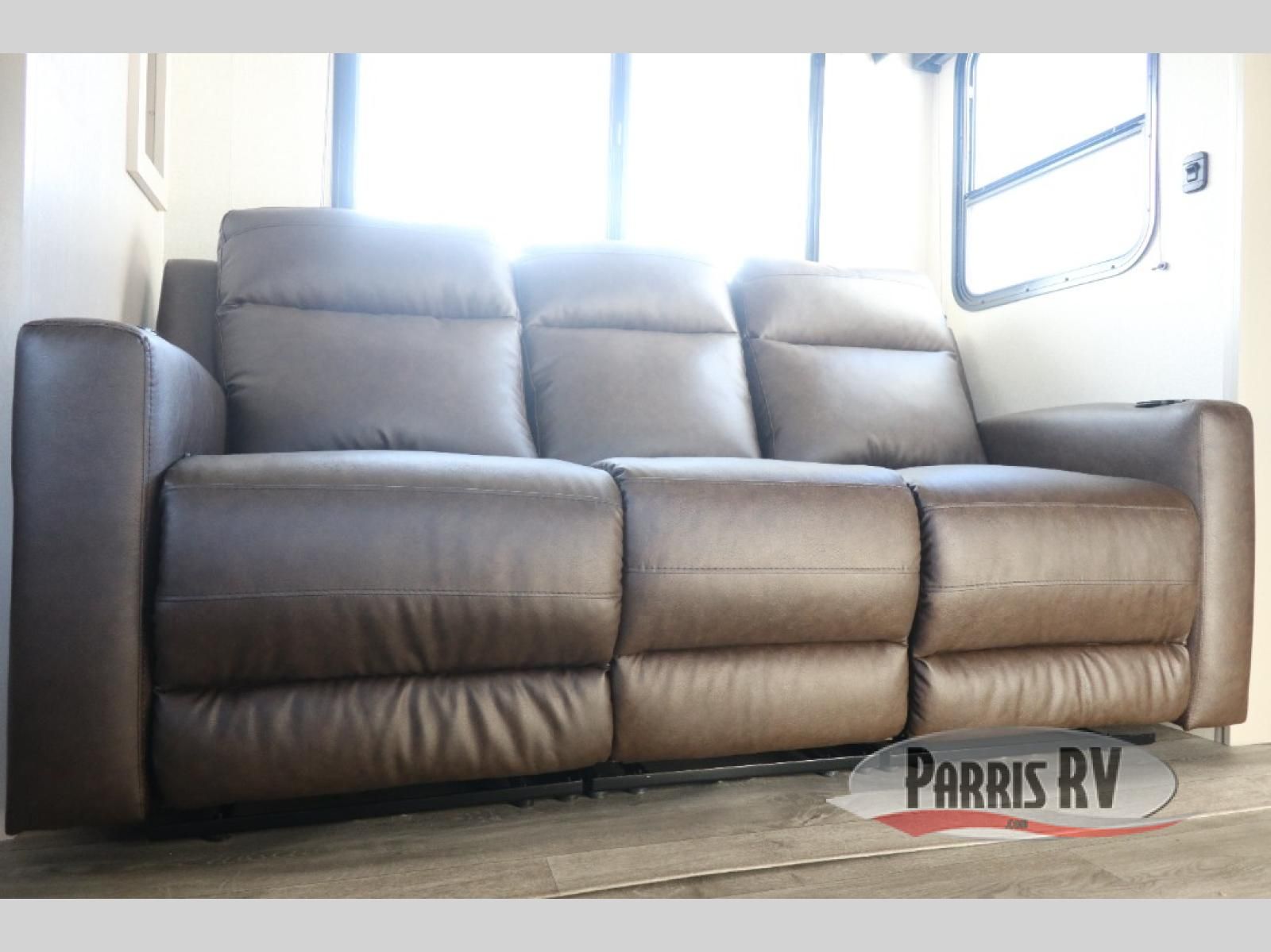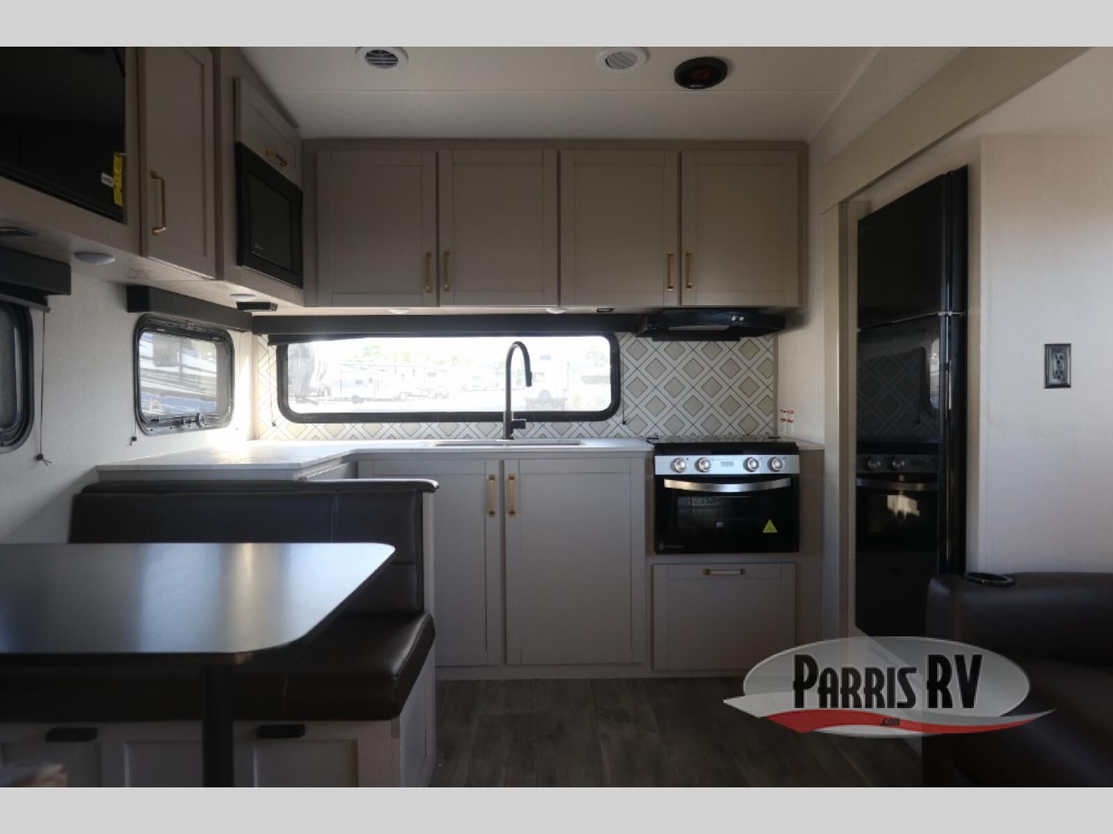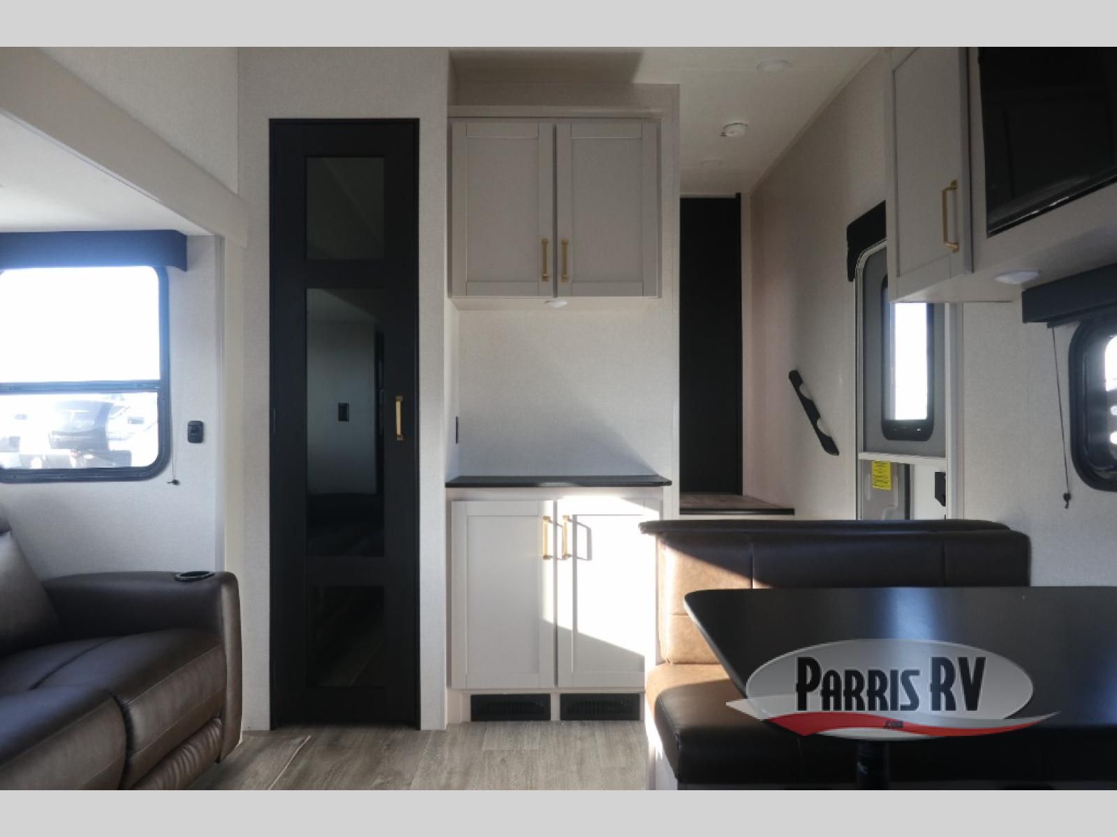 The fifth wheel you were waiting for! The spacious rear kitchen is equipped with a three-burner cooktop, microwave, booth dinette, 12V refrigerator, and sink, providing ample space for meal preparation. Overhead cabinets and a pantry provide ample storage for cookware, dishes, and other essential kitchen items. The living area features a trifold sofa, perfect for relaxation and entertainment. The full bathroom's thoughtful design ensures that everyone has their own space, and the front bedroom is a retreat from the world, featuring a plush queen bed, a spacious wardrobe, and a closet.