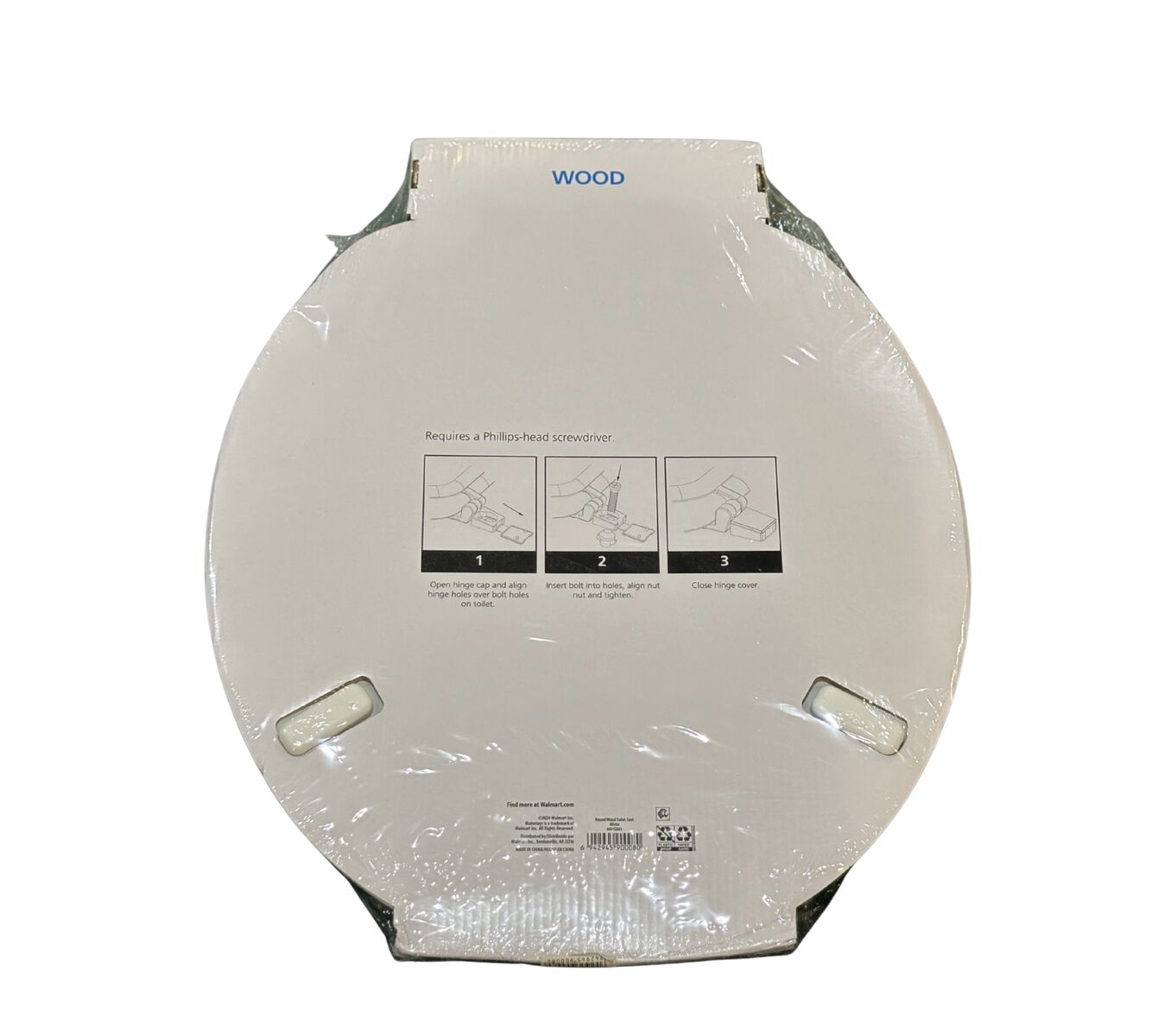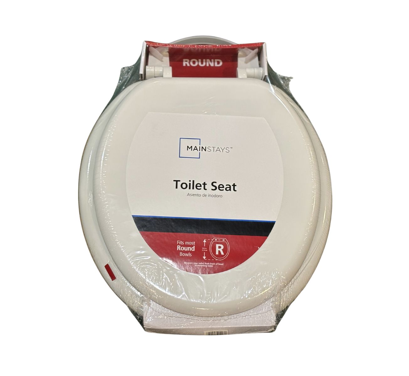 Brand new Mainstays round toilet seat, still sealed and unopened in the original packaging. Standard round size, fits most round toilet bowls.