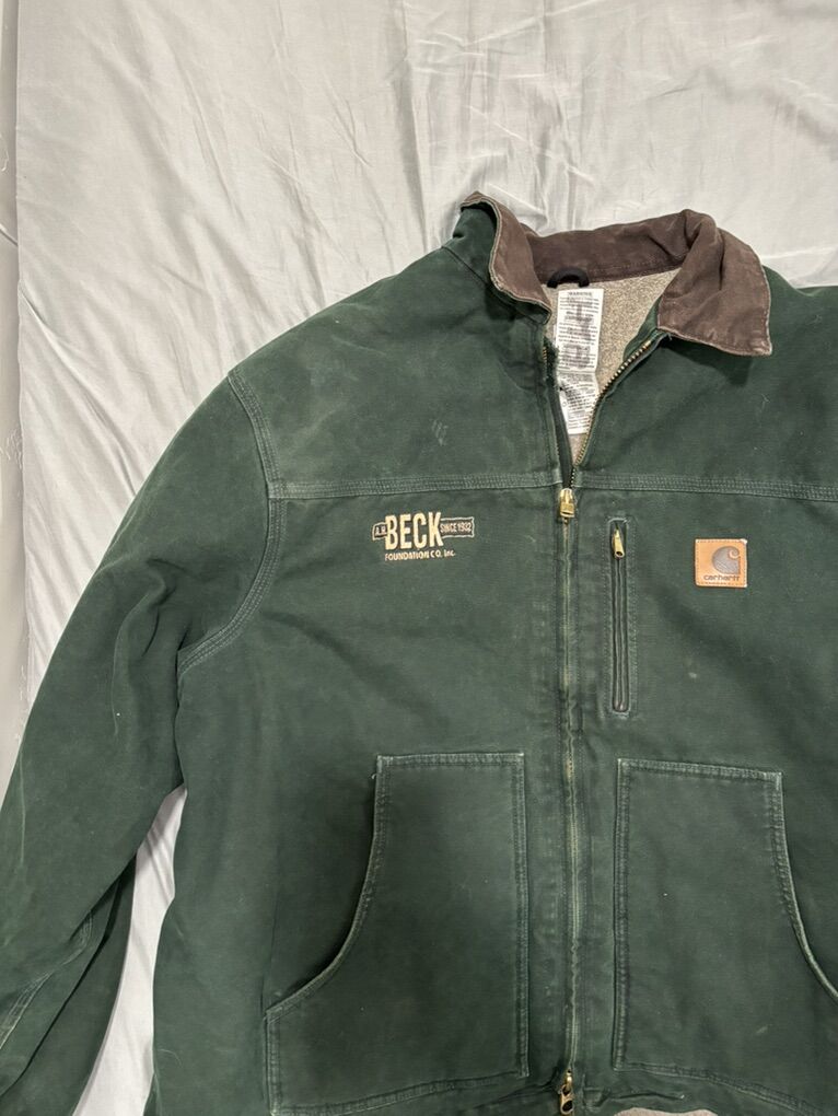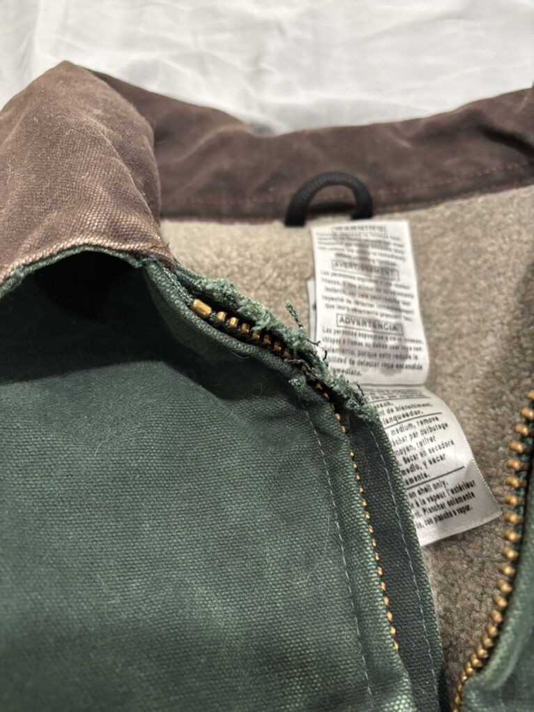 PayPalClassic vintage Carhartt work jacket with a great worn‑in look. Green canvas with a brown corduroy collar and natural fading throughout.
