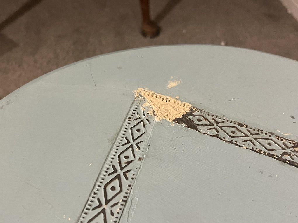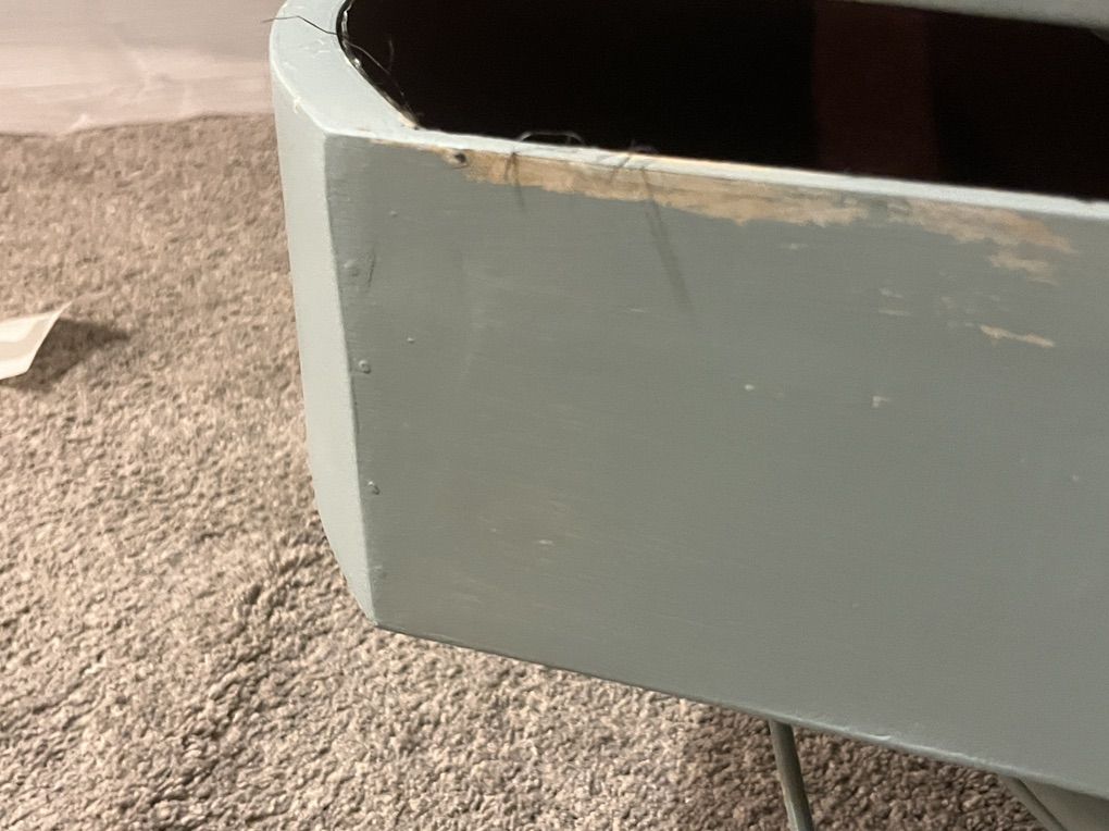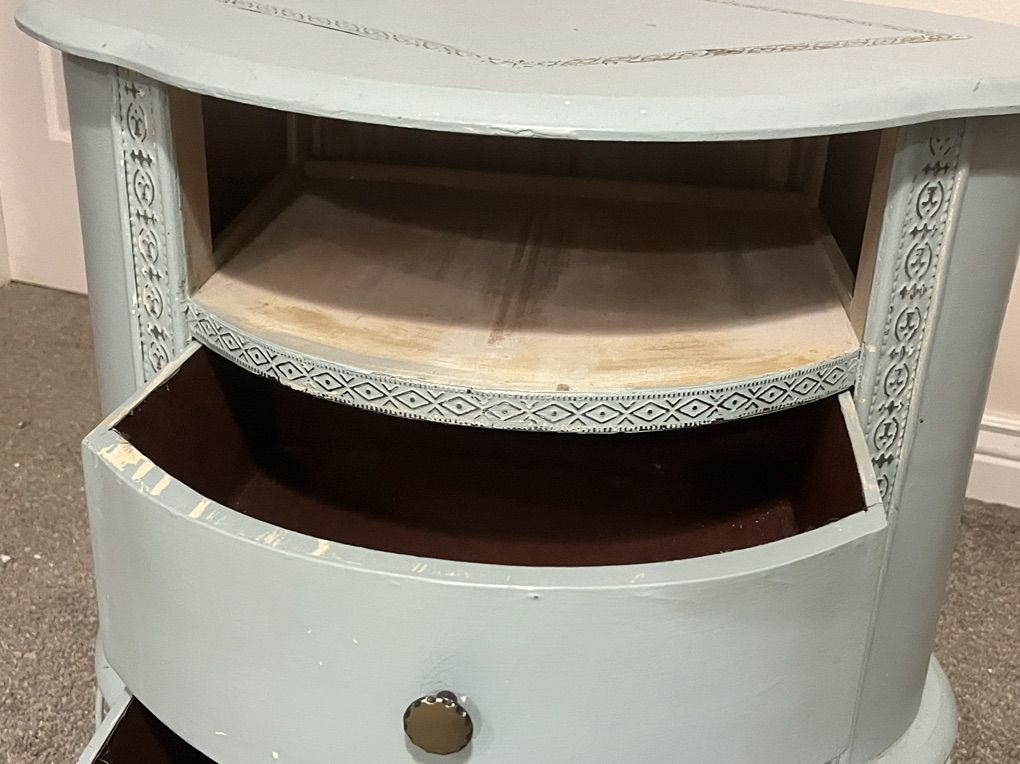 ZelleCute nightstand with metal trim detail. Wood filler on top part with missing trim. Drawers have velvet lining. Looks like drawers are put together with nails. Sticker on bottom says made in china.