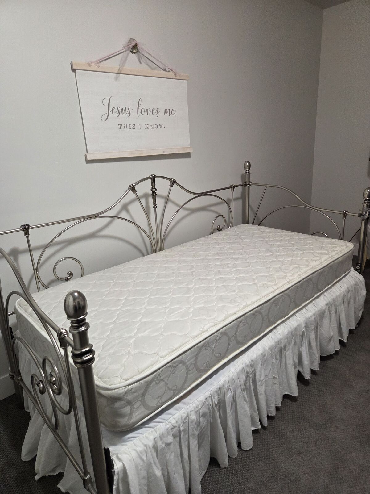 GooglePayDay bed frame with mattress. This bed has been in one of our guest rooms. It has probably been slept on by our granddaughter six times when she has visited us. When she travels with her family they always stay in a hotel so they can swim. We decided to put a queen bed in this room, therefore selling bed frame and mattress.